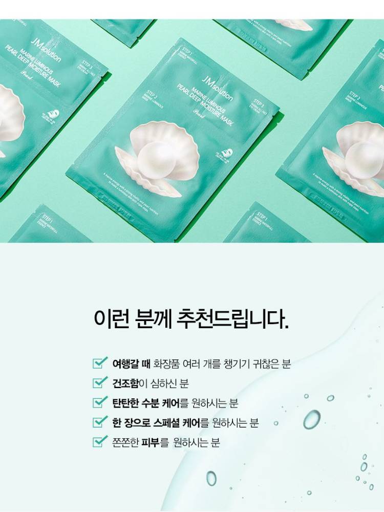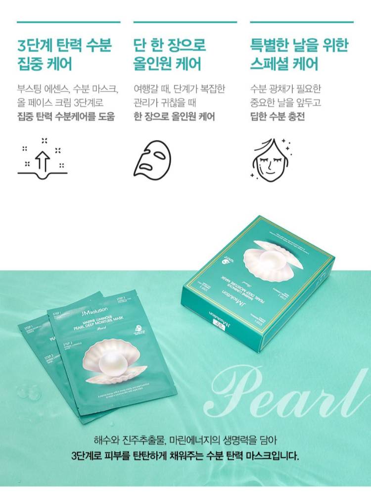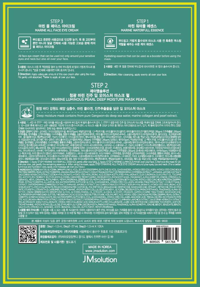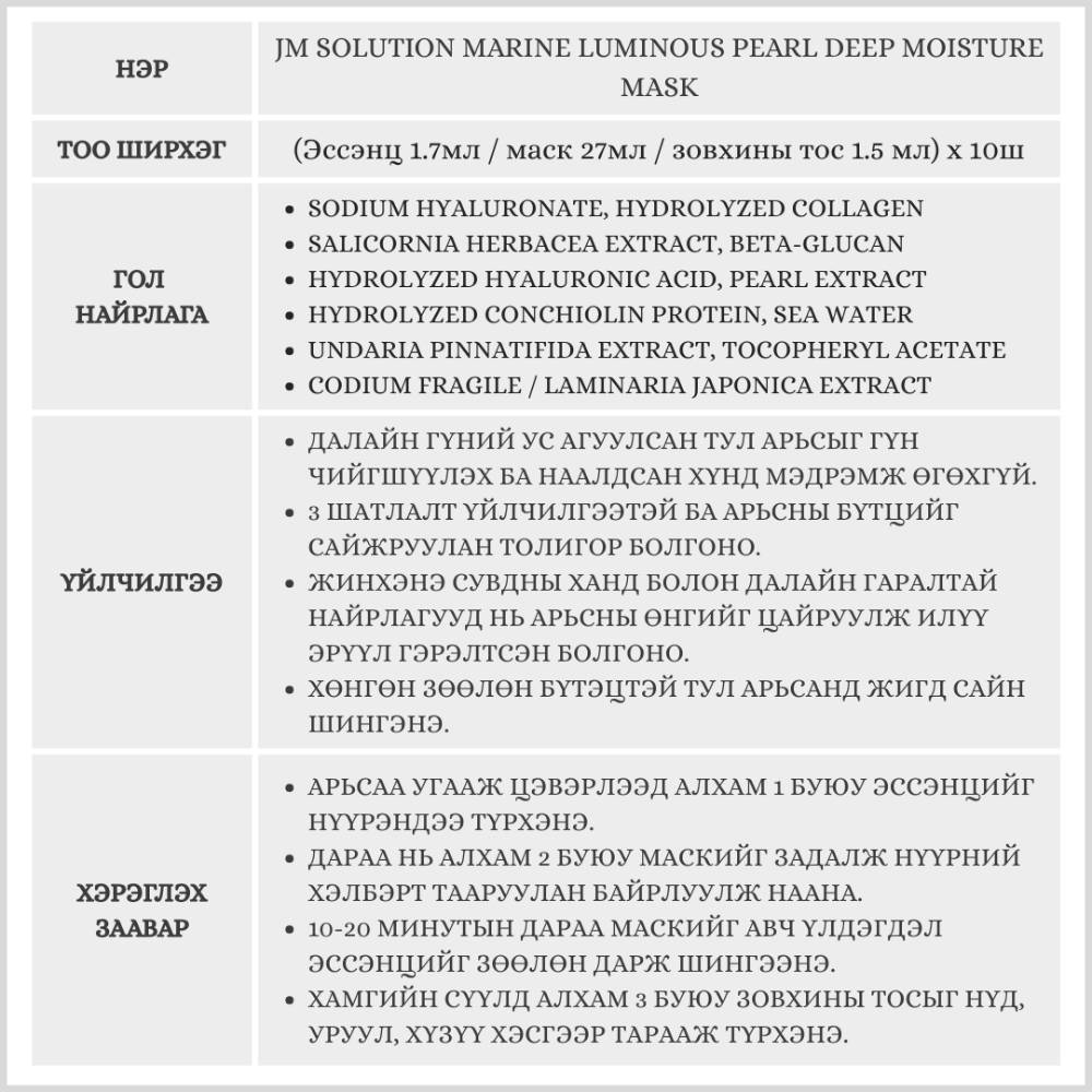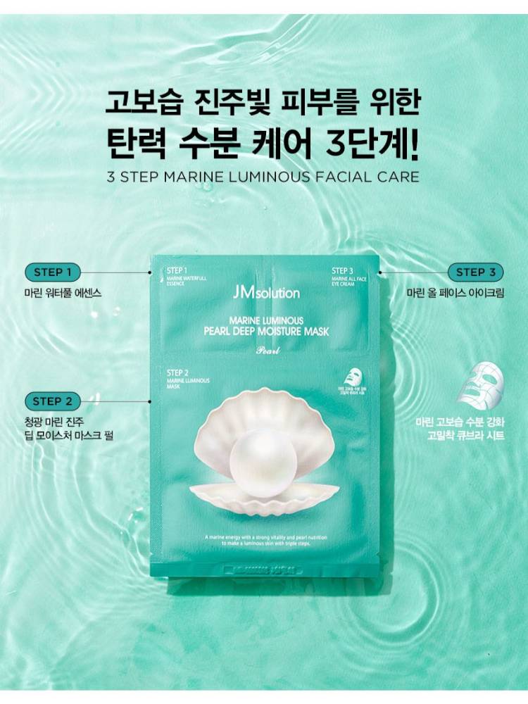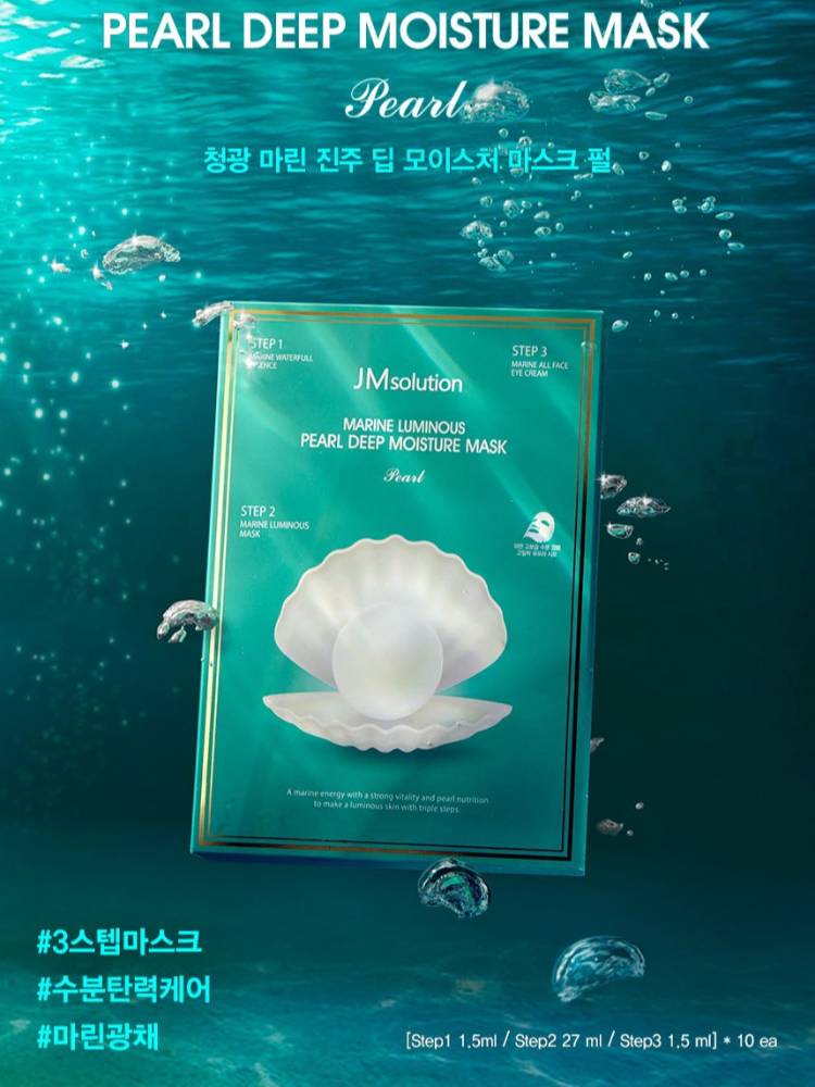 JM Solution брэндийн далайн гүний ус болон жинхэнэ сувдны хандыг найрлагадаа агуулсан 3 шатлалт нүүрний маск. Арьсыг гүн чийгшүүлж цайруулах ба гэрэлтсэн толигор болгоно.