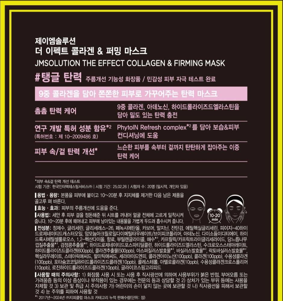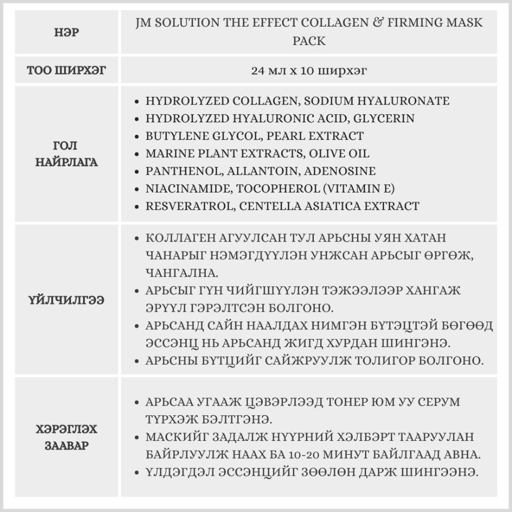 JM Solution The Effect Collagen & Firming маск нь арьсны уян хатан чанарыг нэмэгдүүлж, арьсыг өргөж чангалан залуужуулах үйлчилгээтэй коллаген агуулсан бүтээгдэхүүн юм. Арьсны бүтцийг сайжруулан толигор болгоно.