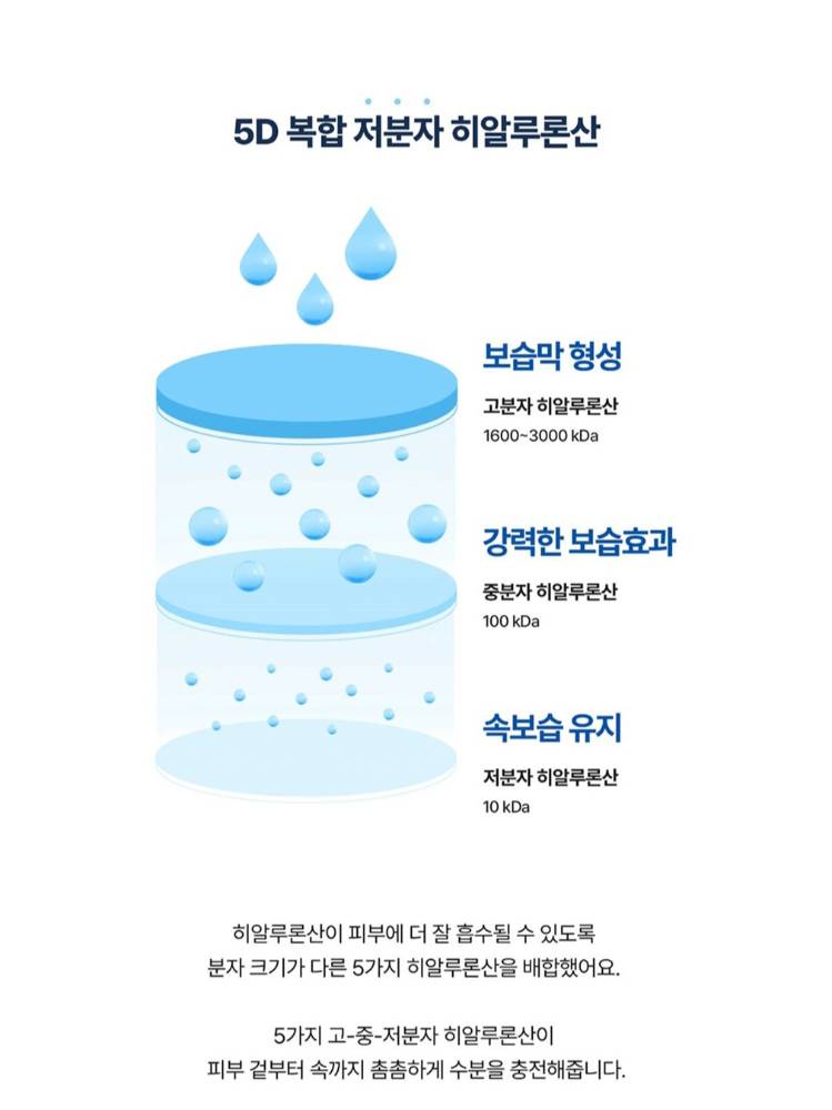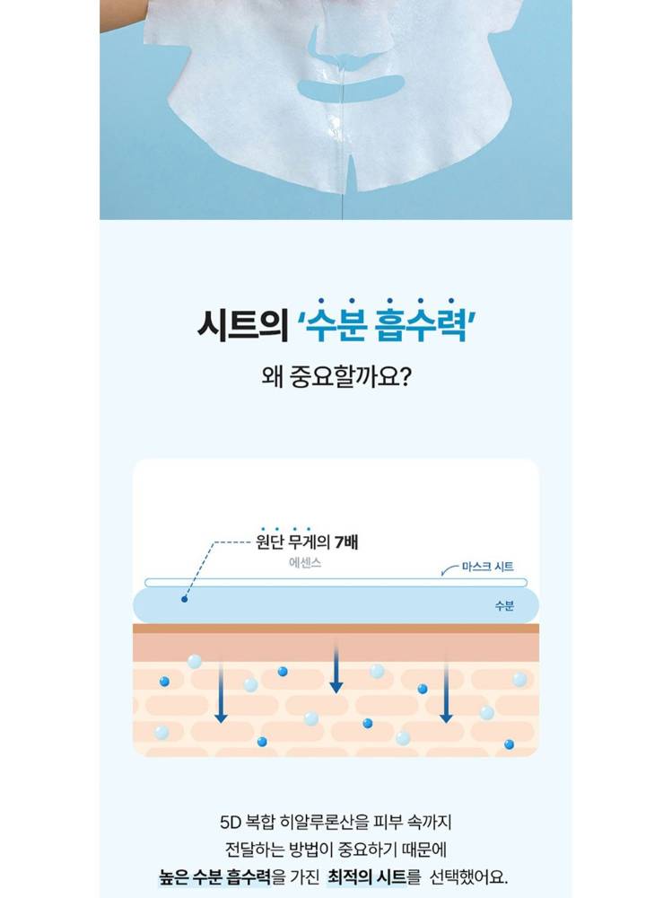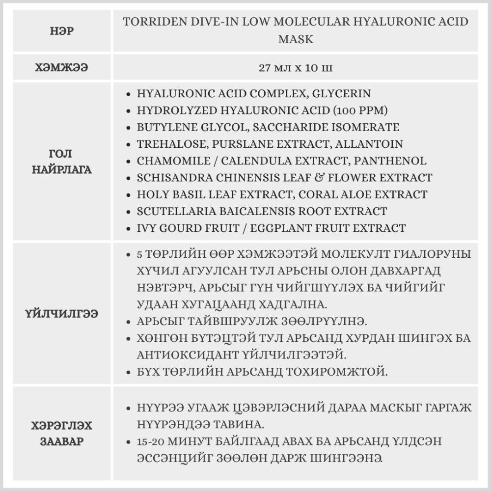 5 өөр төрлийн молекулт гиалоруны хүчил агуулсан тул арьсны бүх давхаргад нэвтэрч, арьсыг гүн чийгшүүлэх үйлчилгээтэй нүүрний маск. Олон төрлийн ургамлын ханд агуулсан тул арьсыг тайвшруулж, зөөлрүүлэх ба антиоксидант үйлчилгээтэй.