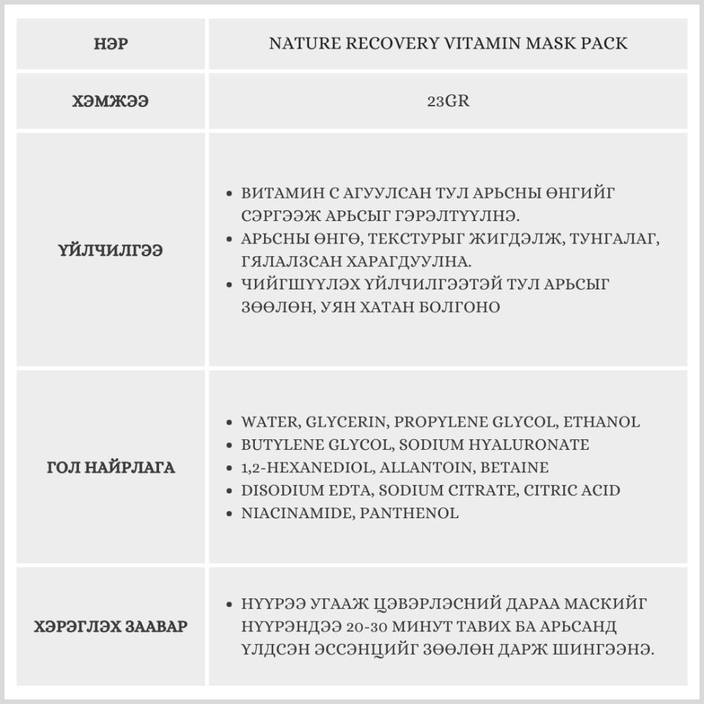 Энэхүү маск нь арьсыг гүн чийгшүүлж, тунгалаг болгоно . Витамин C агуулсан тул арьсны өнгийг жигдэлнэ. Арьсыг зөөлөн, уян хатан эрүүл болгоно.