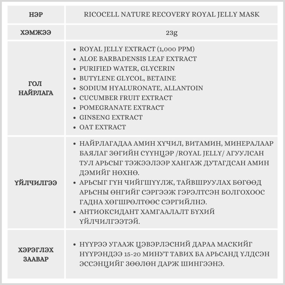 Амин дэмээр баялаг Royal Jelly буюу зөгийн сүүнцэр найрлагадаа агуулсан, арьсыг тэжээлээр хангаж дутагдсан эрдэс бодисыг нөхөх үйлчилгээтэй нүүрний маск. Хөгшрөлтийн эсрэг антиоксидант үйлчилгээтэй.