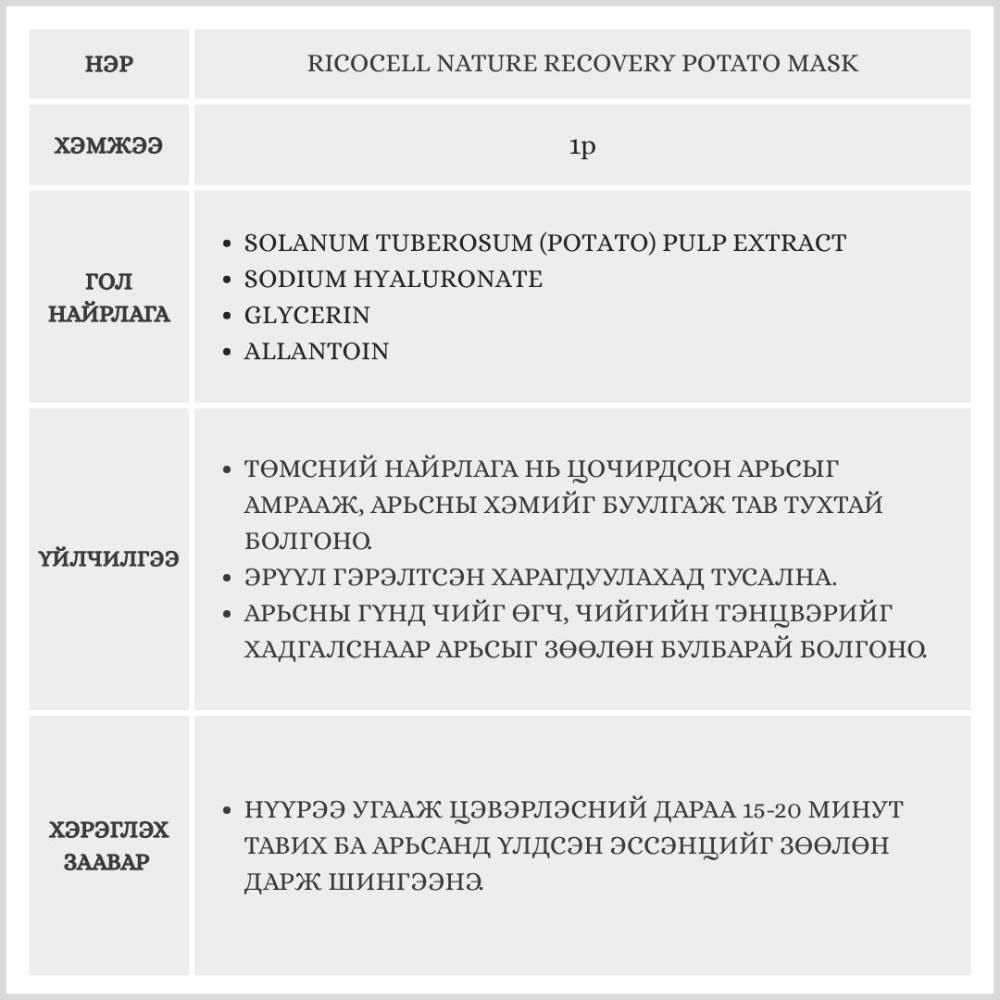 Төмсний хандыг агуулсан бөгөөд цочирдсон арьсыг тайвшруулж, өнгийг нь сэргээнэ. Нарны гэрэл болон гадны нөлөөллөөс болж цочирсон арьсыг зөөлөн толигор болгох байгалийн гаралтай маск юм.