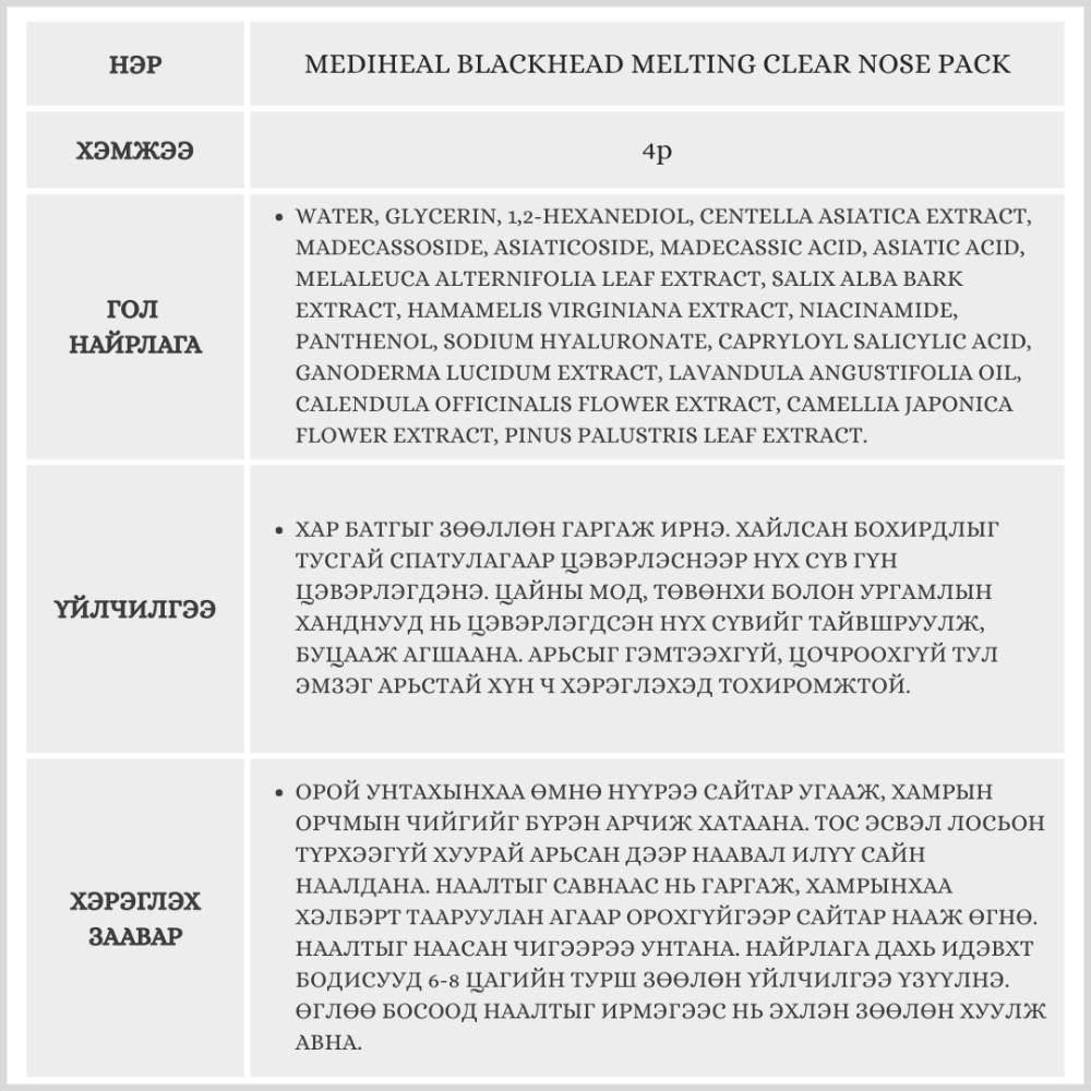 Энэхүү хамрын маск нь хар батгыг тусгай найрлагаар зөөллөн арьсны нүх сүвийг цэвэрлэх зориулалттай. Багцад дагалдах зориулалтын спатулаг ашиглан бохирдлыг зөөлөн хусаж авснаар хамрын арьсыг цочроохгүйгээрээ давуу талтай.
