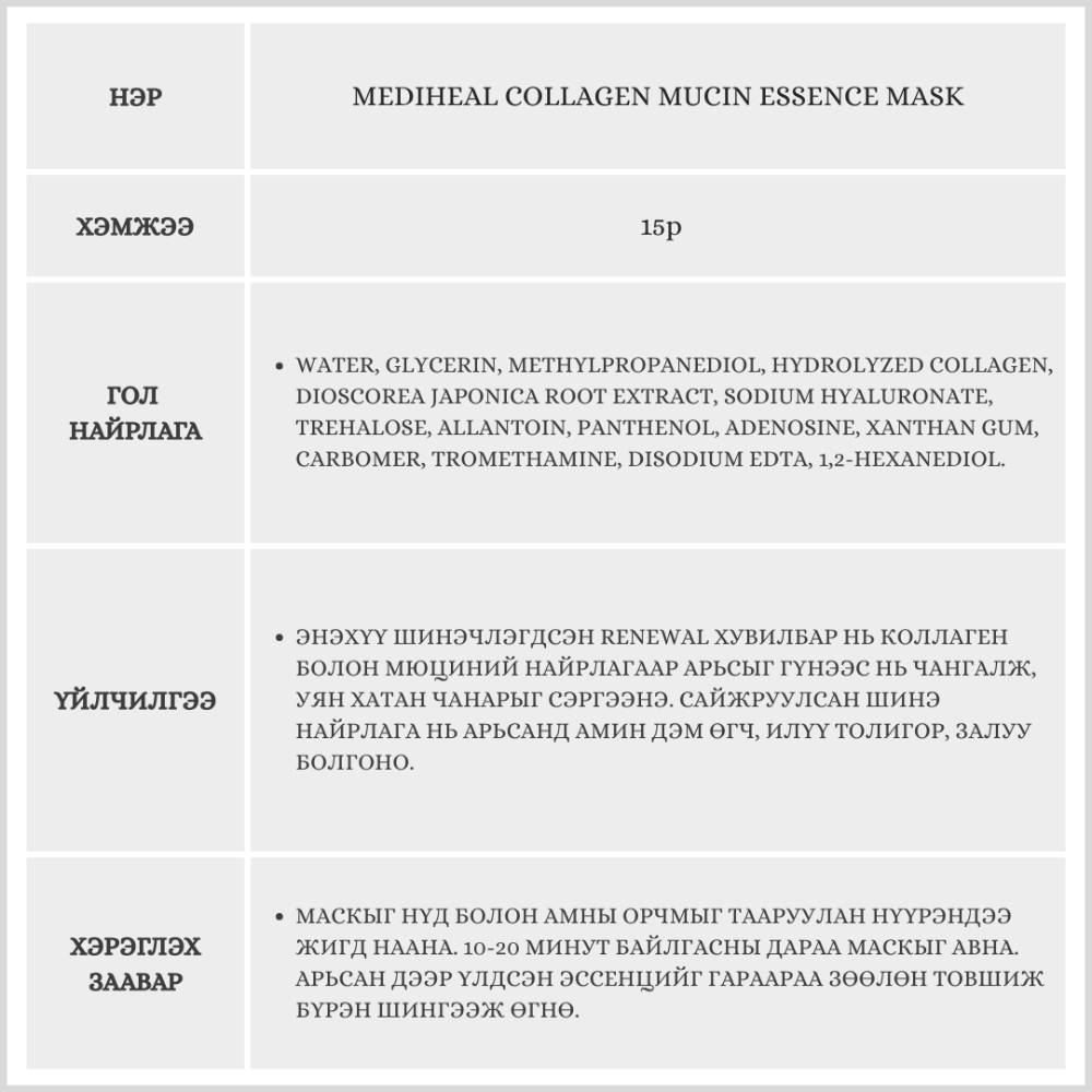 Найрлагадаа коллаген болон ургамлын гаралтай мюцин агуулсан тул арьсыг толигор, чанга болгоход туслах ба сайн чийгшил өгнө.