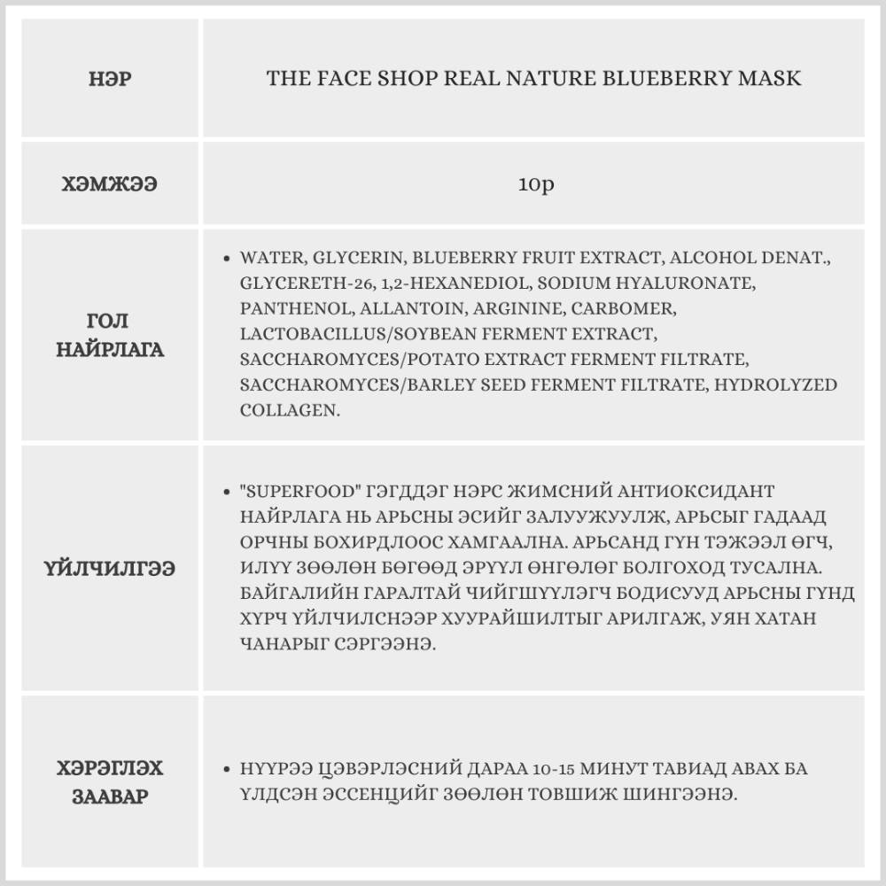 The Face Shop Real Nature Blueberry Mask, 10p /Салфеткан маск/