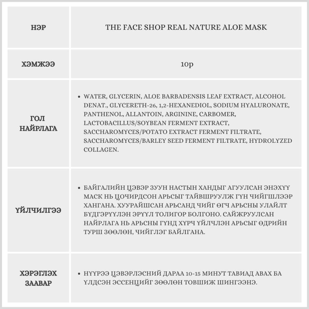 The Face Shop Real Nature Aloe Mask, 10p /Салфеткан маск/