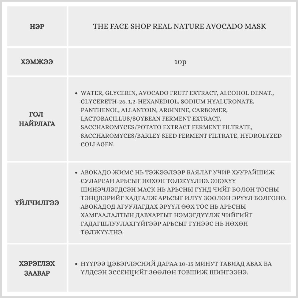 The Face Shop Real Nature Avocado Mask, 10p /Салфеткан маск/