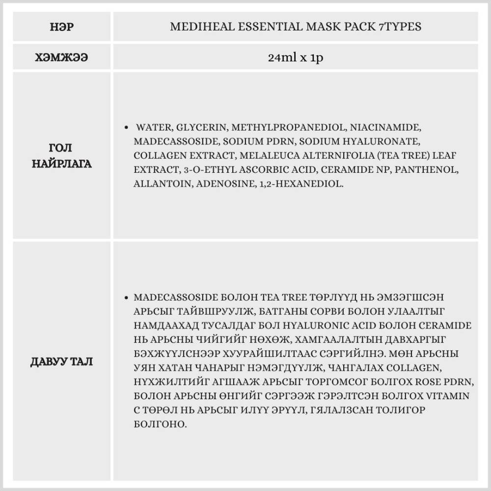 Арьсны өөр өөр асуудалд зориулсан 7 төрлийн маск нь байгалийн гаралтай хулсны целлюлозоор хийгдсэн тул маскан дахь эссенцийг арьсанд гүн шингээж өгдөгөөрөө онцлогтой бүтээгдэхүүн юм.
