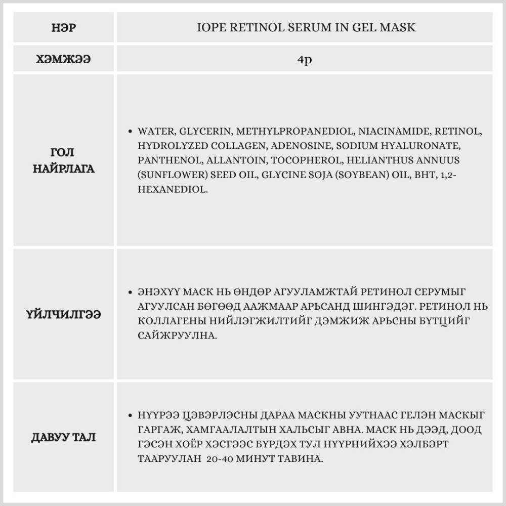 Үрчлээг тэнийлгэх, уян хатан чанарыг сайжруулах болон нүхжилтийг агшаах үйлчилгээтэй дээд зэрэглэлийн гелэн маск юм. Бэлгэнд 1 ширхэг маск илүү дагалдана. Бэлгэнд 1 ширхэг маск дагалдана.