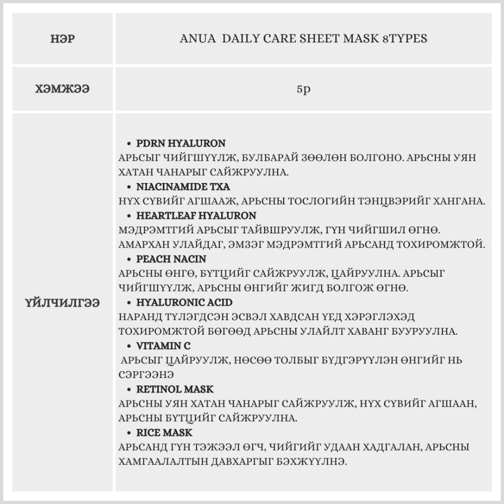 Энэхүү бүтээгдэхүүн нь 8 төрөлтэй бөгөөд арьсныхаа төрлөөс хамааран тохируулж сонгон хэрэглэх боломжтой. 1 ширхэг маск бэлгэнд дагалдана.