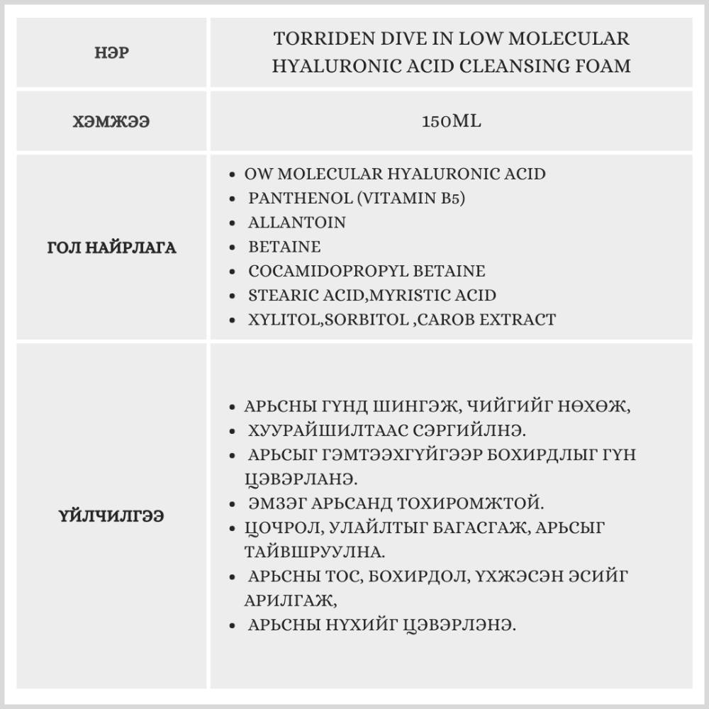 Арьсны гүнд шингэж, чийгийг нөхөж, хуурайшилтаас сэргийлнэ. Эмзэг арьсанд тохиромжтой. Арьсны тос, бохирдол, үхэжсэн эсийг арилгаж,арьсыг тайвшруулна . PH 5.5 тэнцвэржүүлнэ. Өдөр тутмын хэрэглээнд тохиромжтой.