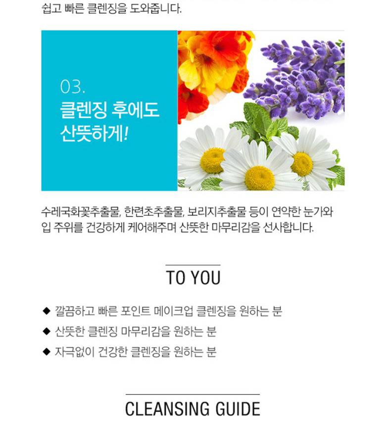 Усанд тэсвэртэй болон ердийн уруул, нүдний будгийг үр дүнтэй арилгагч. Ус + тосны орцтой ба будгийг сайн уусгаж арилгадаг. Borage Extract найрлага нь чийгшүүлэх, хамгаалах үйлчилгээтэй. Нүд ба уруулын эмзэг арьсанд зориулсан тайвшруулах найрлагуудыг агуулсан бүтээгдэхүүн.