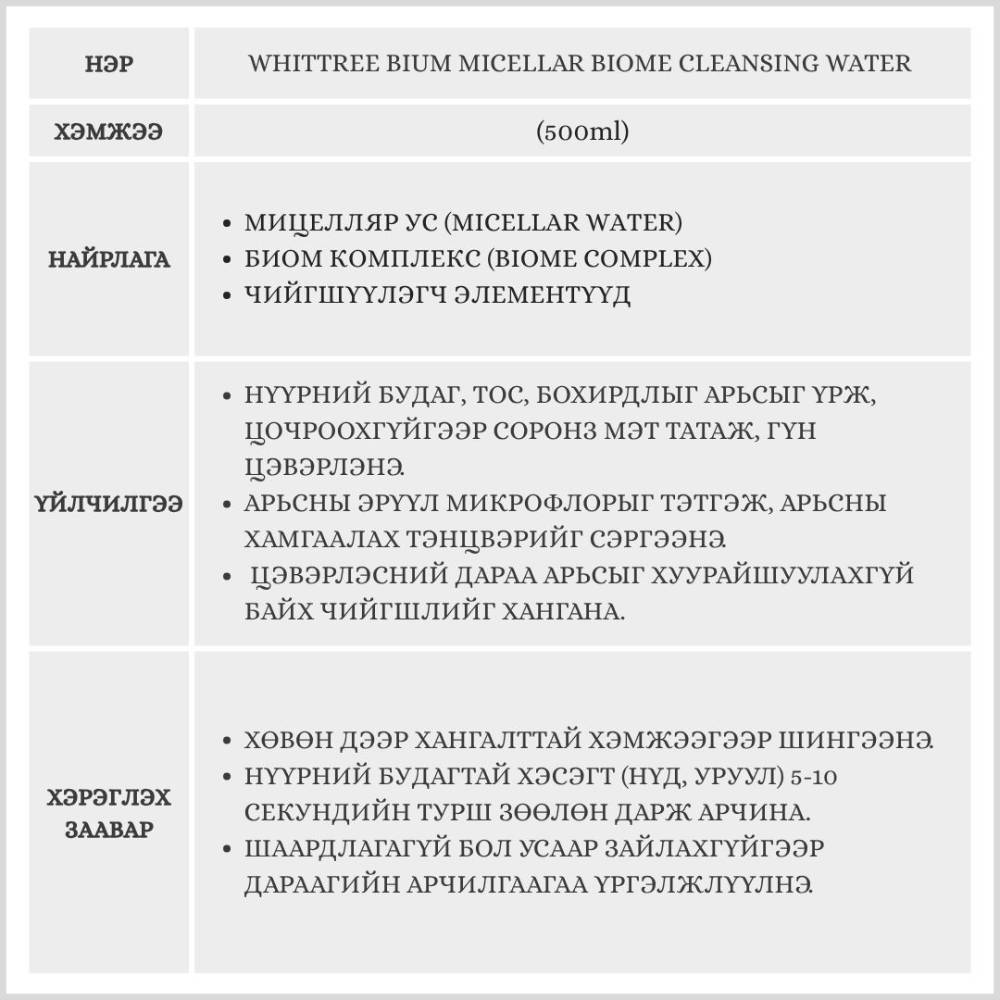 Мицелляр технологи болон биомын найрлагыг хослуулсан, арьсыг гүн цэвэрлэх, чийгшүүлэх үйлчилгээтэй цэвэрлэгч ус юм. Арьсны нүх сүв дэх нүүрний будаг, тос, бохирдлыг үр дүнтэйгээр цэвэрлэхээс гадна, арьсны байгалийн тэнцвэрийг хадгалан, цэвэрлэсний дараа хуурайшихаас сэргийлнэ.