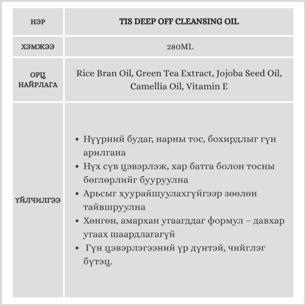 Арьсны нөхөн төлжилтийг дэмжиж, эрүүл гялалзсан болгоно. Антиоксидант үйлчилгээтэй, арьсыг тайвшруулж хамгаална. Тосны тэнцвэрийг хадгалж, зөөлөн уян болгоно. Парабен, сульфат, хиймэл үнэр оруулагч агуулаагүй. Будаа, ногоон цай, камелийн тосны байгалийн хандтай.