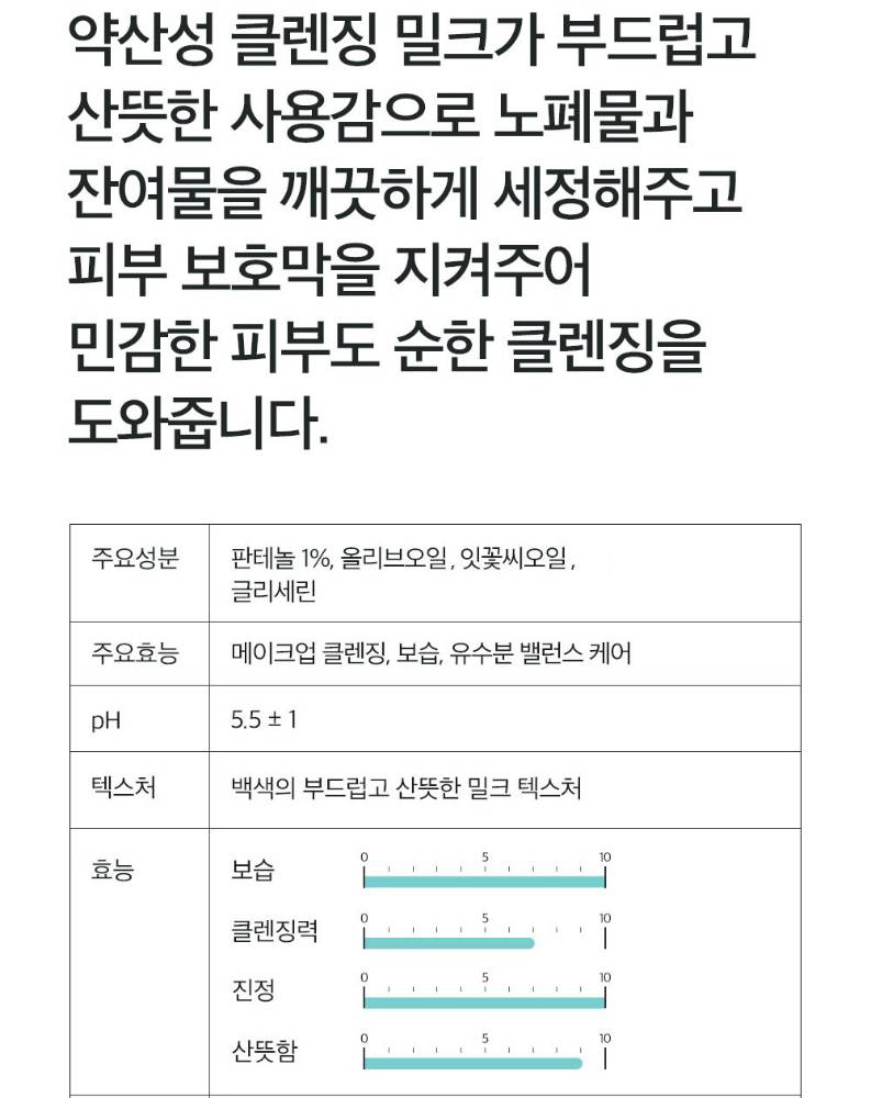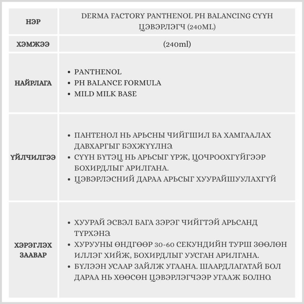 Пантенол (B5 провитамин) болон арьсны рН-ийн тэнцвэрийг хослуулсан, арьсны хамгаалах давхаргыг гэмтээхгүйгээр зөөлөн цэвэрлэх үйлчилгээтэй сүүн цэвэрлэгч юм.