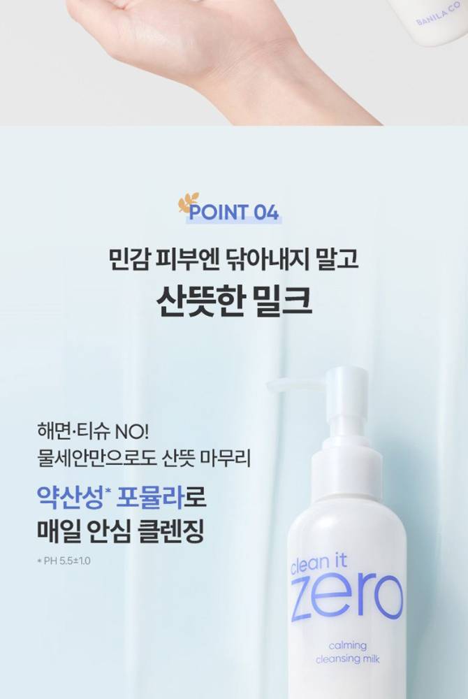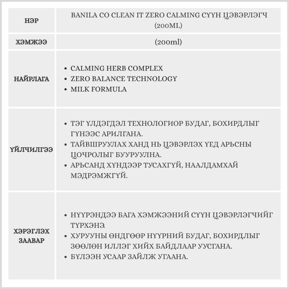 Алдарт Clean It Zero цувралын нэг хэсэг бөгөөд тайвшруулах(Calming) найрлагатайгаар бүтээгдсэн сүүн цэвэрлэгч юм. Хөнгөн, шингэн бүтэцтэй тул арьсыг цочроохгүйгээр гүн цэвэрлэж, нүүрний будаг болон бохирдлыг үр дүнтэйгээр арилгана.