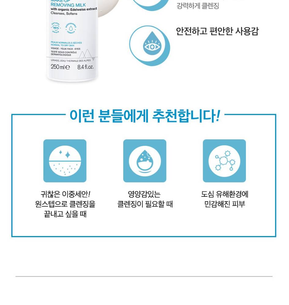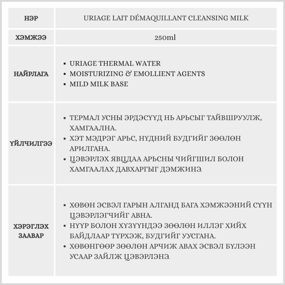 Францын Альпийн Урижын Термал Ус-ыг суурь болгон бүтээгдсэн, маш эмзэг, хэт мэдрэг арьсанд зориулсан сүүн цэвэрлэгч юм. Нүүр болон нүдний эргэн тойрны будгийг зөөлөн арилгахын зэрэгцээ, арьсыг чийгшүүлж, тайвшруулах үйлчилгээтэй.