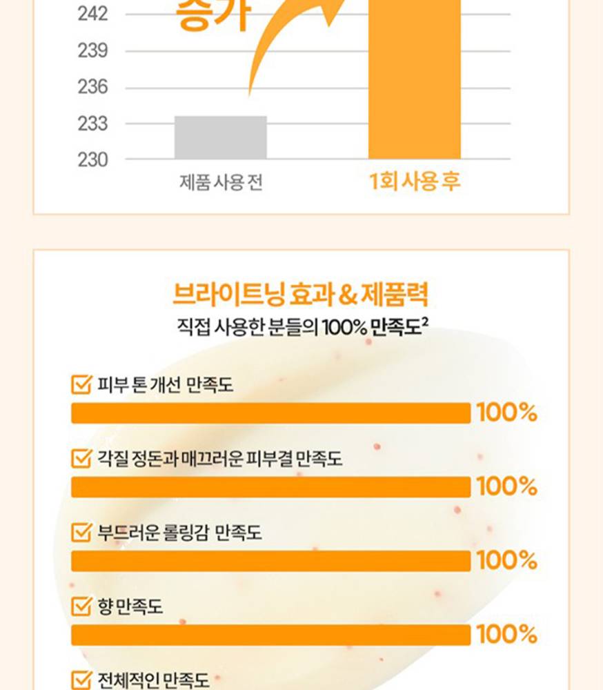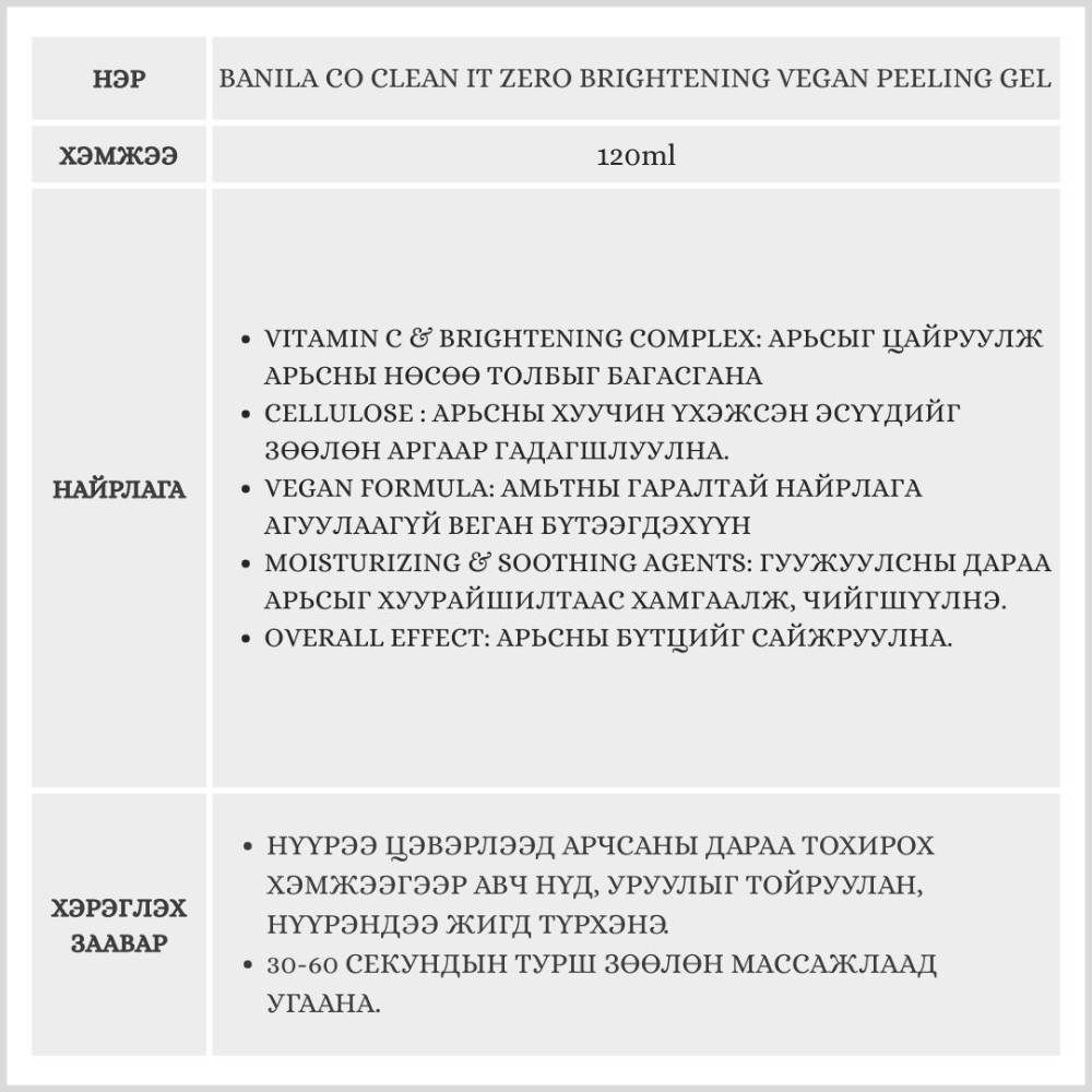 Веган найрлагатай, чийгшүүлэх болон гэрэлтүүлэх үйлчилгээг хослуулсан, арьсны үхэжсэн эсүүдийг зөөлөн гуужуулна. Энэхүү гуужуулагч нь арьсыг цочроохгүйгээр цэвэрлэж, арьсны өнгийг сэргээн , толигор зөөлөн болгоно.