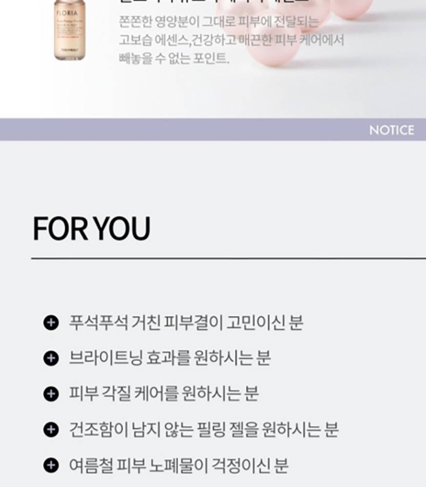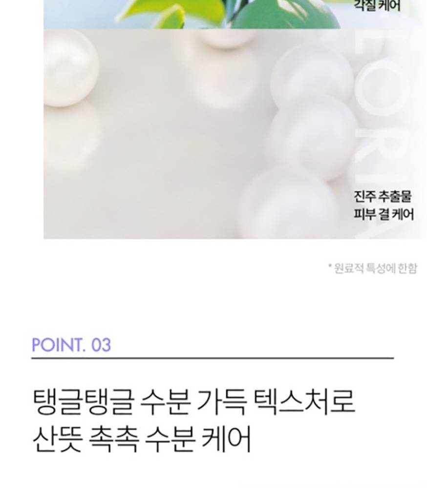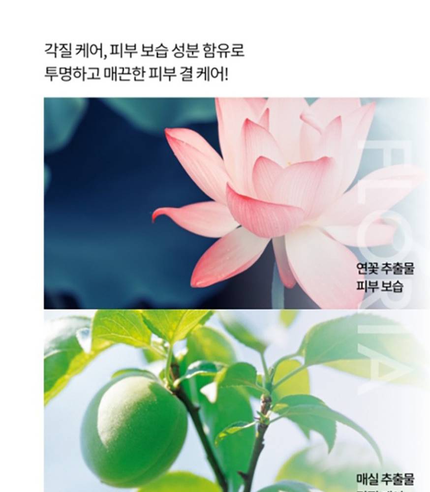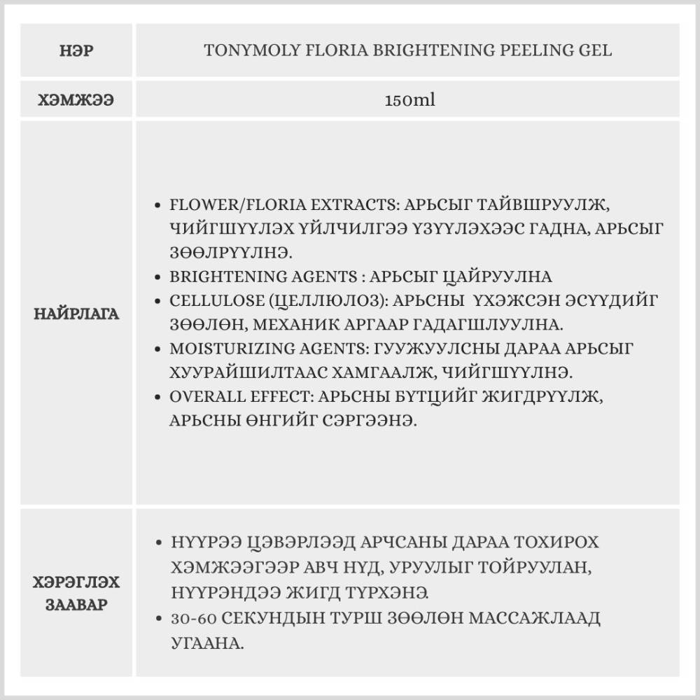 Цэцэгсийн ханд/Floria/Flower Extracts/ болон цайруулах найрлагуудыг агуулсан. Арьсны үхэжсэн эсүүдийг зөөлөн гуужуулж, арьсны өнгийг сэргээх гуужуулагч юм. Арьсанд чийгшил өгөхөөс гадна, гэрэлтсэн, толигор арьсны бүтцийг бий болгоход туслана.