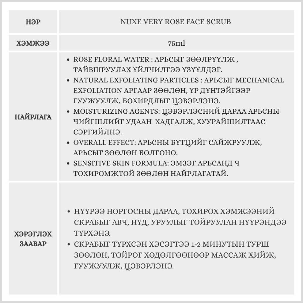 Сарнай цэцгийн хандтай ус болон байгалийн гаралтай гуужуулагч Exfoliating-аар баяжуулсан, үрчлээний эсрэг үйлчилгээтэй скраб юм. Энэхүү скраб нь арьсны хуучин үхэжсэн эсүүдийг арилгаж, арьсыг гүн цэвэрлэхээс гадна, арьсыг чийгшүүлж, толигор зөөлөн болгоно.