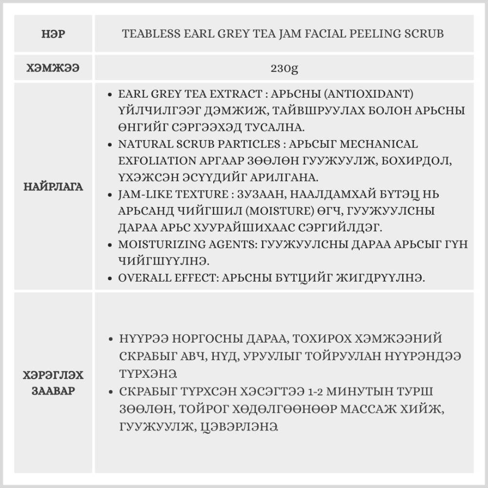 Tea Jam-тай төстэй наалдамхай бүтэцтэй, гуужуулах болон Скрабны үйлчилгээг хослуулсан, Earl Grey Tea хандтай бүтээгдэхүүн юм. Энэхүү скраб нь арьсны үхэжсэн эсүүдийг зөөлөн арилгаж, арьсыг гүн цэвэрлэхээс гадна, бохирдол, илүүдэл тослогийг арилгаж, гэрэлтсэн, чийглэг мэдрэмжийг олгоно.