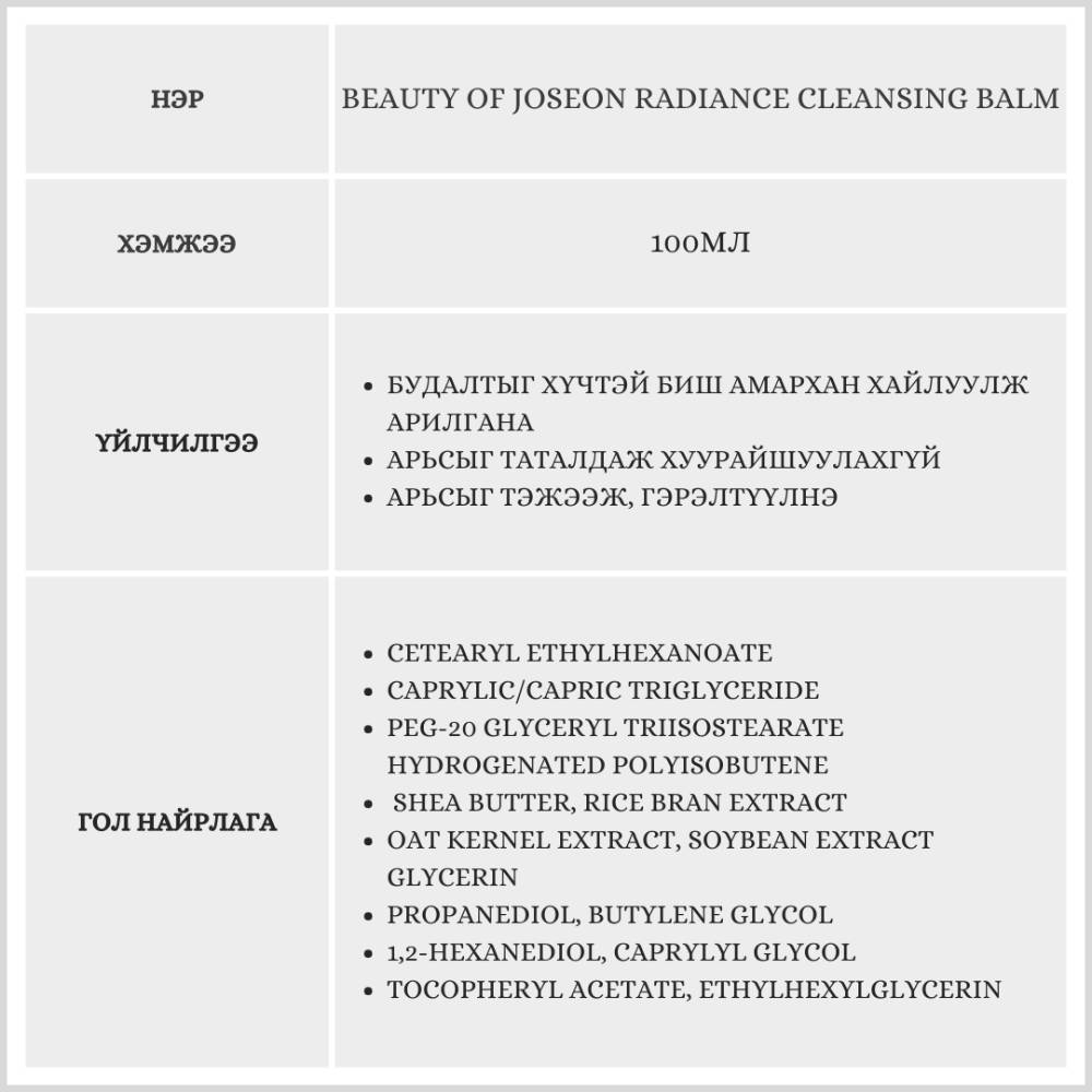 Нүүрний будаг болон тослогийг зөөлөн хайлуулан арилгана. Угаасны дараа таталдахгүй бөгөөд арьсны чийгийг алдагдуулахгүй цэвэрлэнэ. Угаасны дараа арьс булбарай зөөлөн болж, илүү гэрэлтсэн харагдана.
