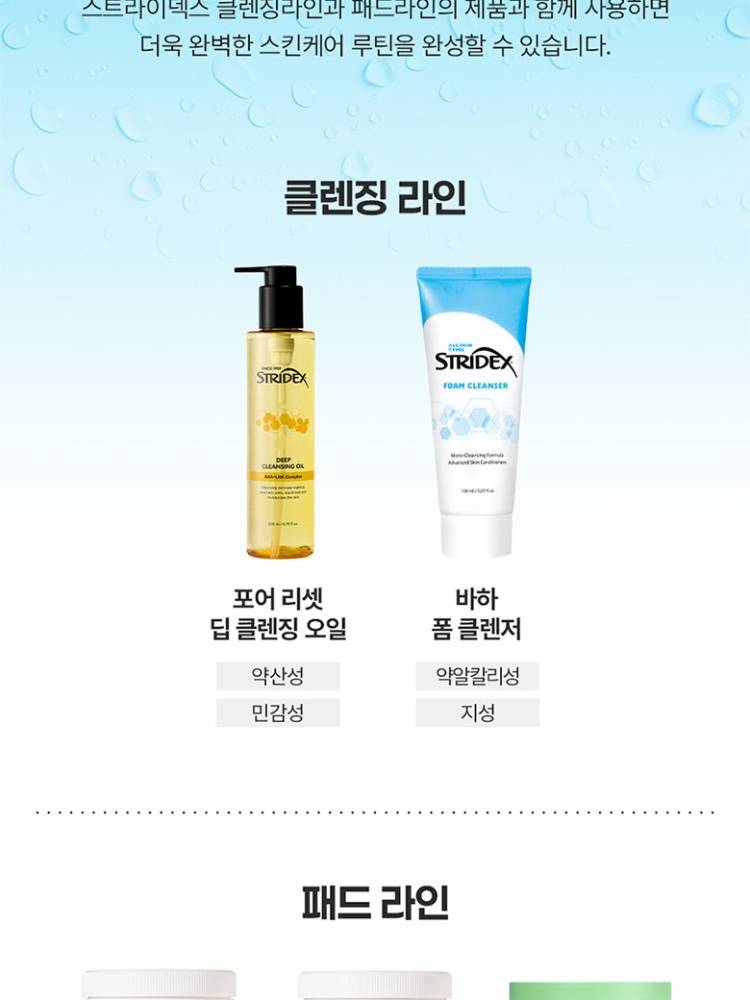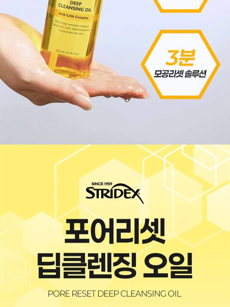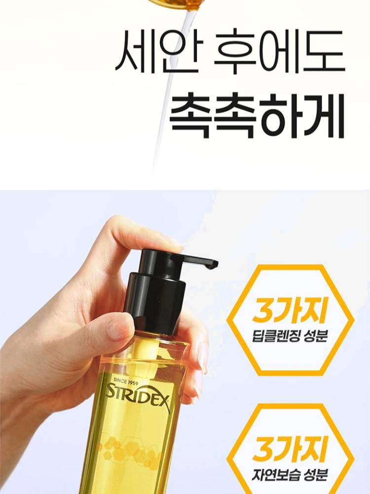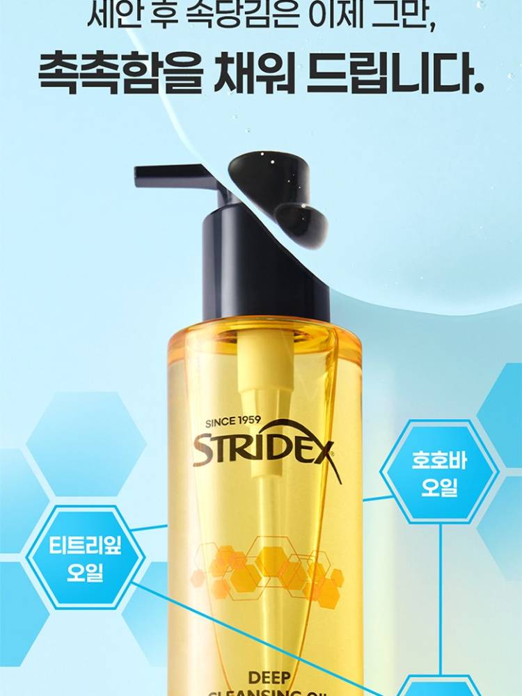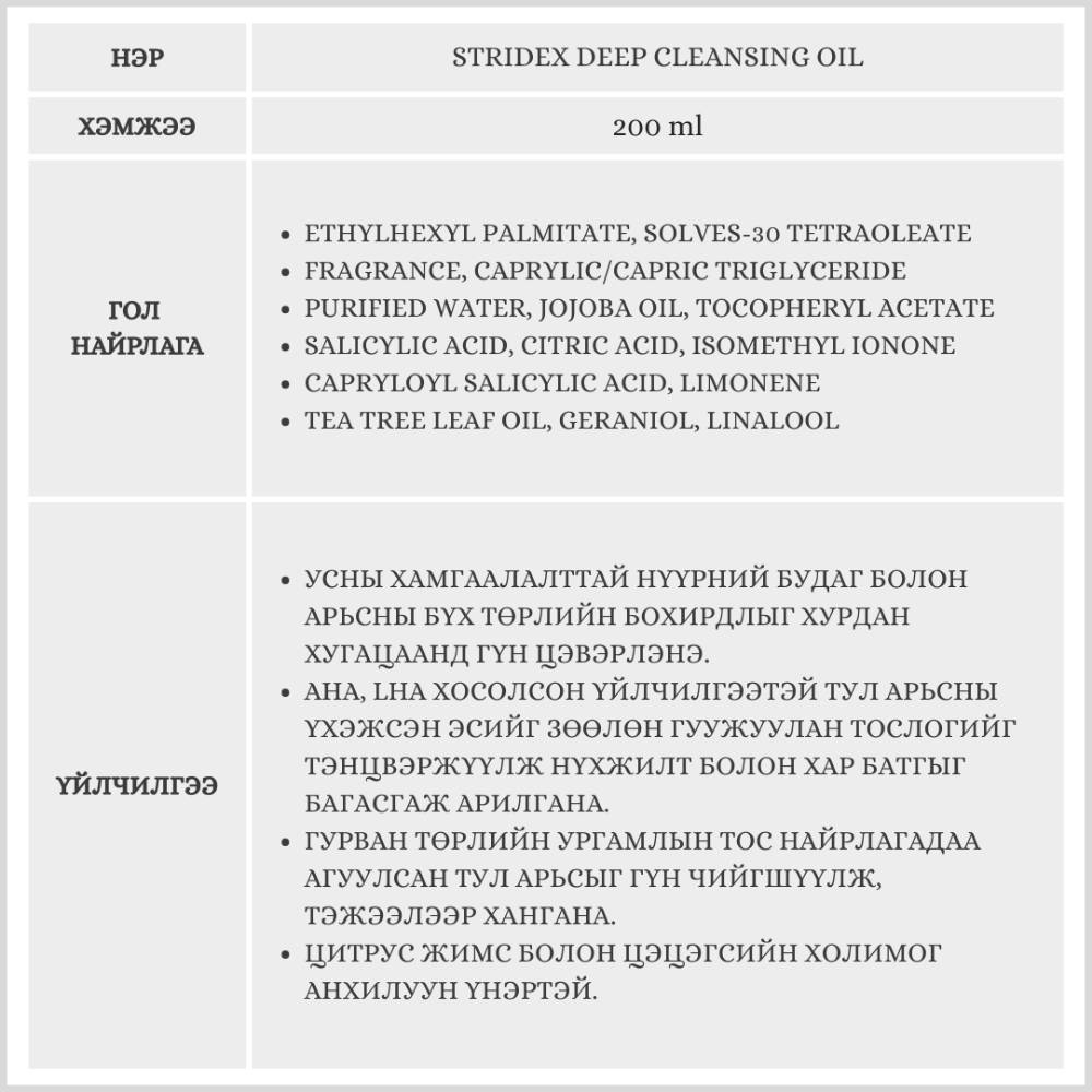Stridex Deep Cleansing Oil тосон цэвэрлэгч нь нүүрний будаг болон арьсны бохирдлыг гүн цэвэрлэхээс гадна үхэжсэн эсийг зөөлөн гуужуулан нүхжилт болон хар батгыг багасгаж арилгах үйлчилгээтэй.