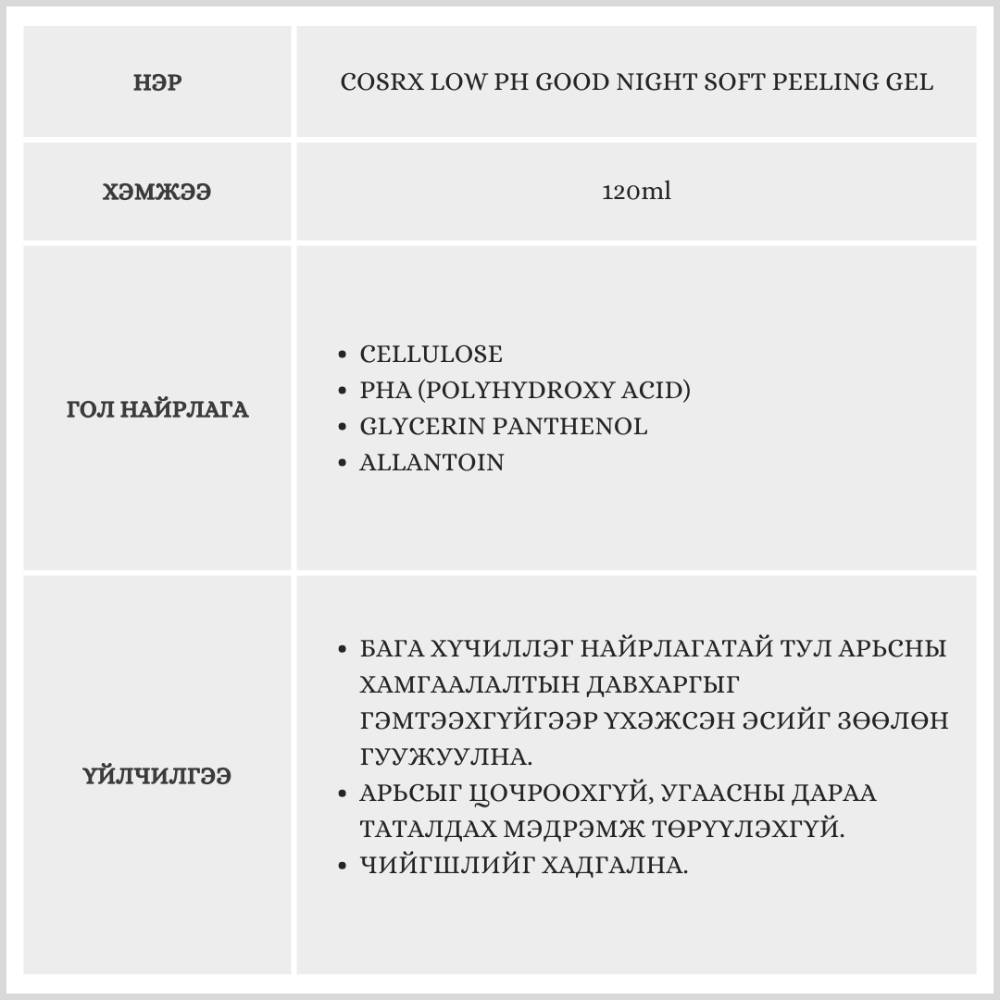 Энэхүү пилинг гель нь бага хүчиллэг найрлагатай тул арьсны хамгаалалтын давхаргыг алдагдуулахгүйгээр үхэжсэн эсийг зөөлөн гуужуулна.