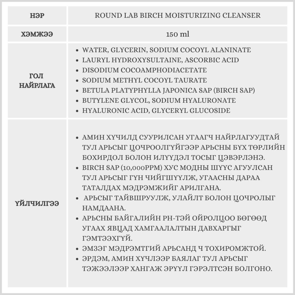 Арьсыг цочроохгүйгээр арьсны бохирдлыг зөөлөн цэвэрлэх хөөсөн нүүр угаагч. Хус модны шүүс агуулсан тул арьсыг гүн чийгшүүлэх ба угаасны дараа арьсыг таталдуулахгүй.