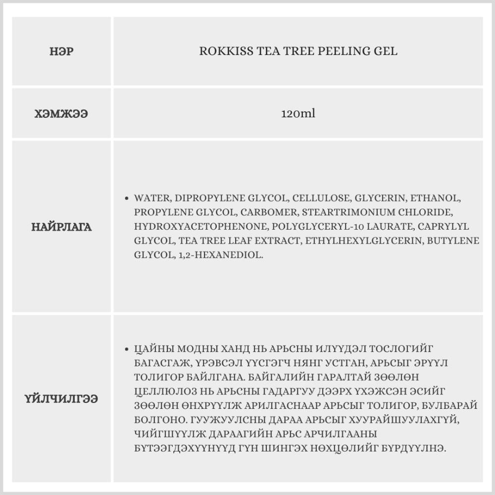Tea Tree Peeling Gel нь байгалийн гаралтай цайны модны найрлагаар арьсны илүүдэл тослог болон үхэжсэн эсийг цэвэрлэх зөөлөн гуужуулагч юм.