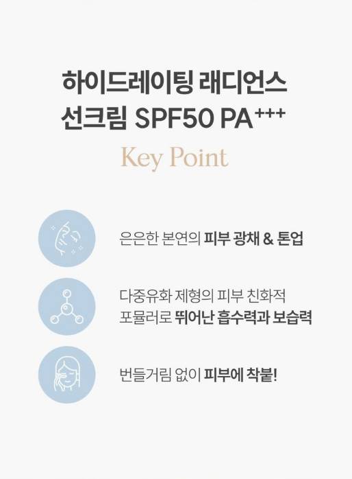 SPF50+ PA+++ бүхий хүчтэй нарны хамгаалалттай. Арьсыг гүн чийгшүүлж, өдрийн турш хамгаална. Арьс борлох, нөсөө толбо, сэвх үүсэхээс урьдчилан сэргийлнэ. Tone-up эффекттэй учир арьсны өнгийг өргөж, илүү гэрэлтсэн болгоно.