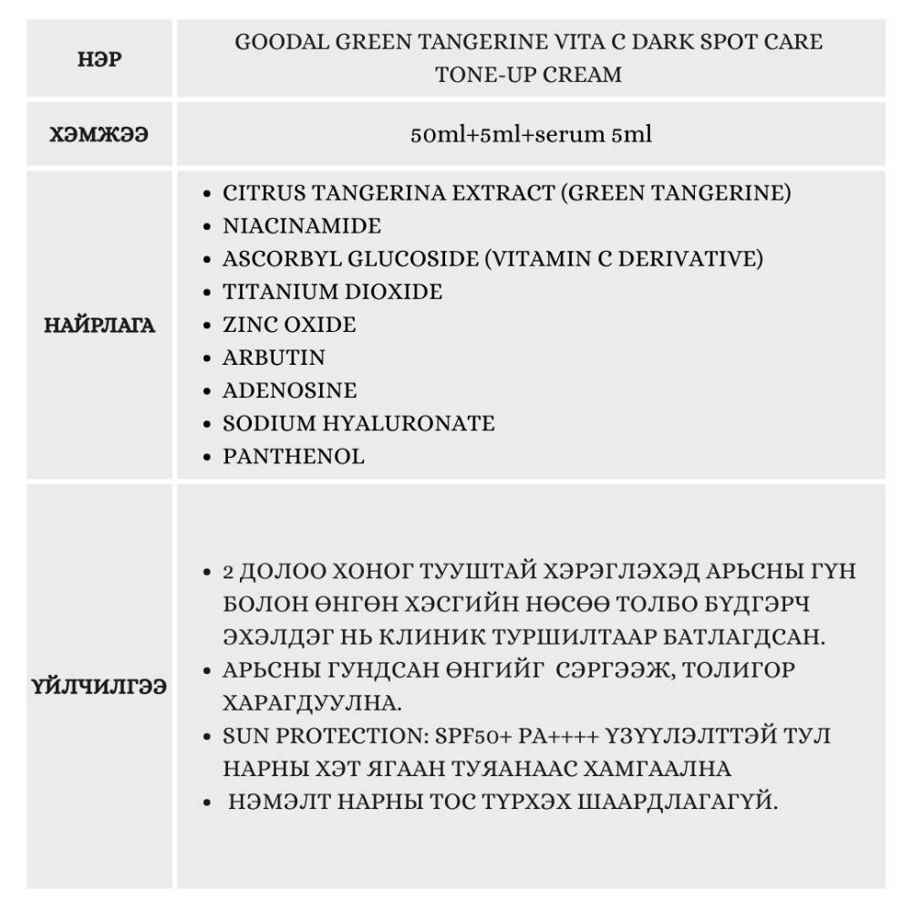 Энэхүү тос нь арьсыг зөвхөн цайруулах бус, Витамин C-ийн нөлөөгөөр нөсөө толбыг бүдгэрүүлнэ. Бэлгэнд нарны тос 5мл болон серум 10мл дагалдана.