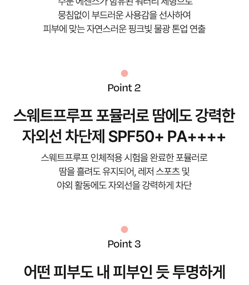 Чийгшүүлэгч тос шиг хөнгөн, усан бүтэцтэй тул арьсанд амархан шингэж, нарны хэт ягаан туяанаас хамгаална. Арьсны өнгийг зөөлөн tone up хийнэ.