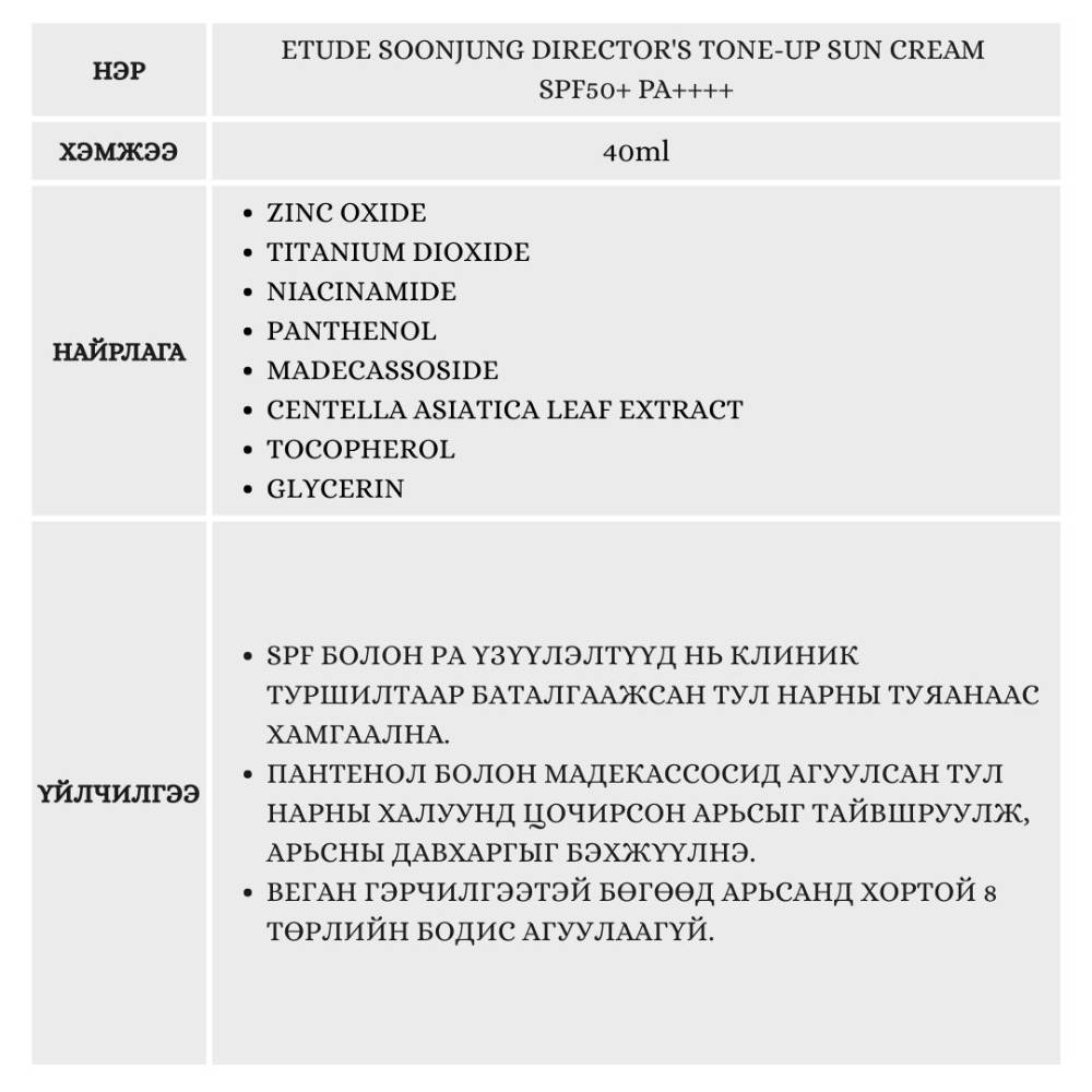 [Бэлэгтэй] Etude SoonJung Director's Tone up Sun Cream SPF50+ PA++++, 40ml /Нарны тос/