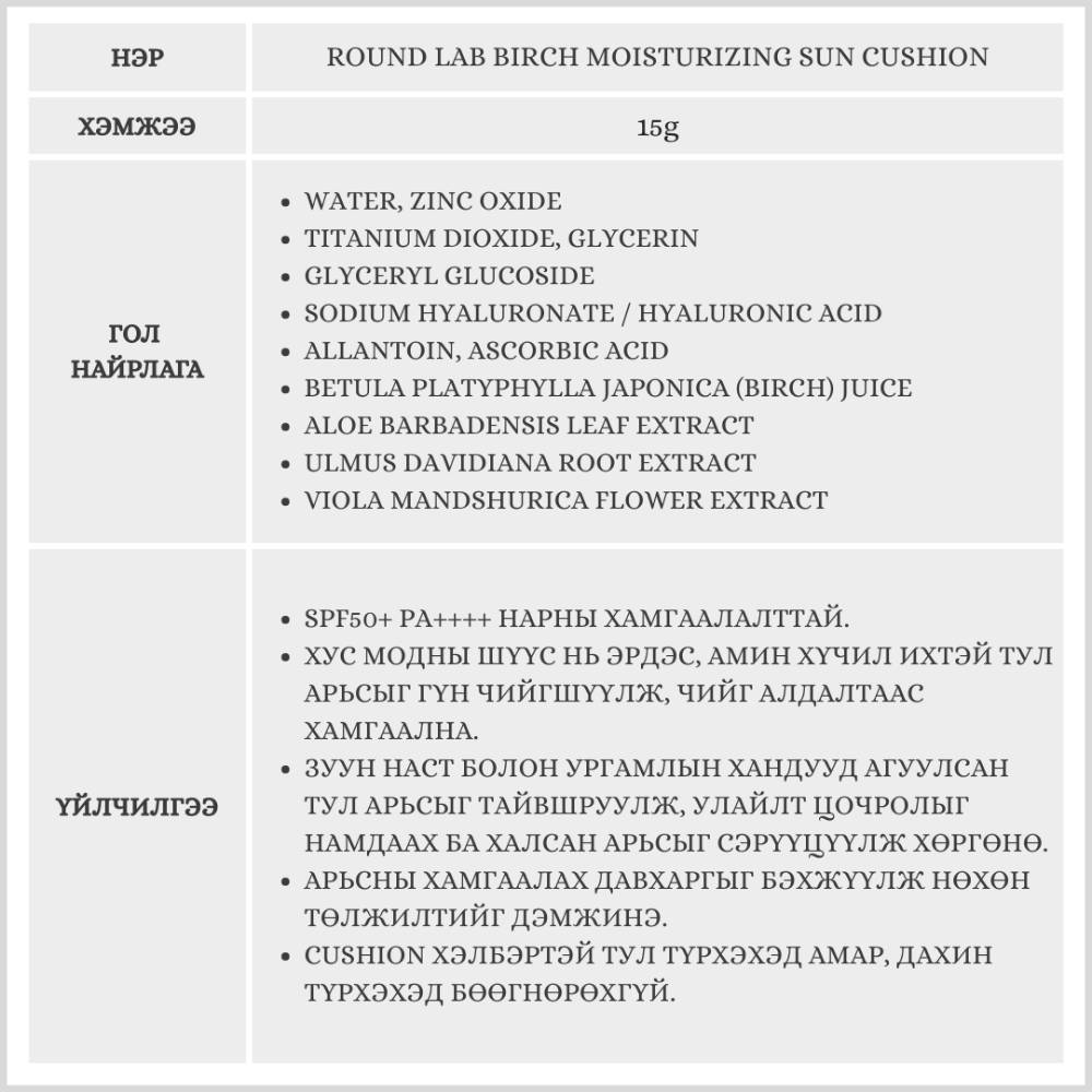 Round Lab Birch Moisturizing Sun Cushion нь нарнаас хамгаалах, чийгшүүлэх, тайвшруулах үйлчилгээг нэг дор хослуулсан бүтээгдэхүүн бөгөөд хус модны шүүс найрлагадаа агуулсан тул арьсыг гүн чийгшүүлж, чийгийг өдрийн турш хадгална.
