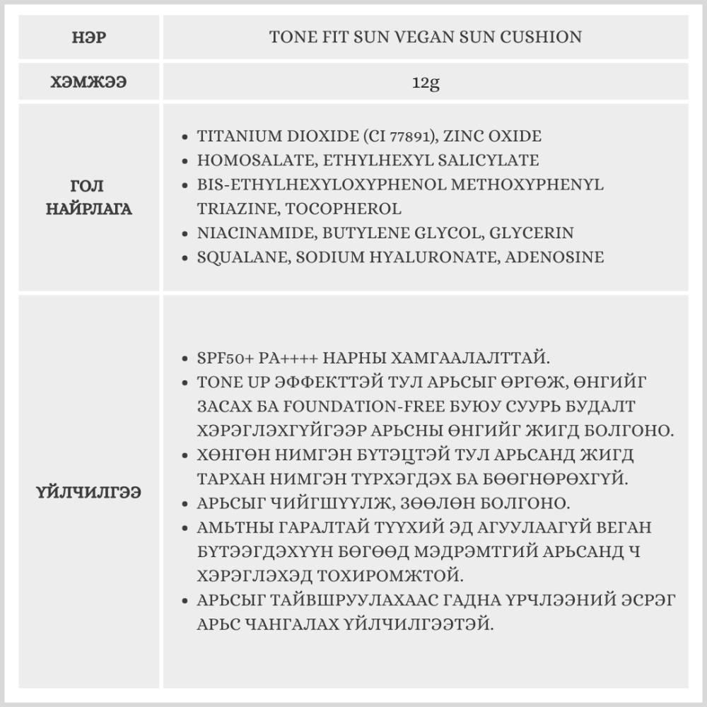 Суурь будалтны шаардлагагүй, арьсны өнгийг засаж өргөх tone up эффекттэй нарнаас хамгаалах веган cushion. Арьсыг тайвшруулж, чийгшүүлэх ба нарны хэт ягаан туяанаас найдвартай хамгаална.