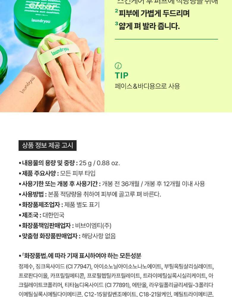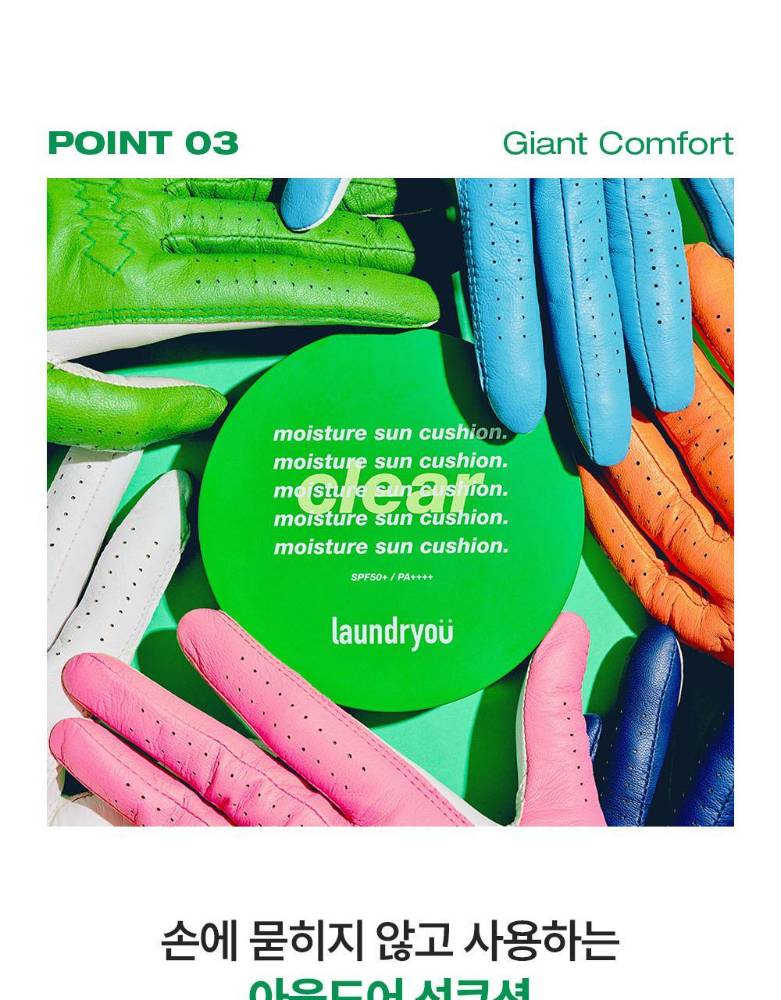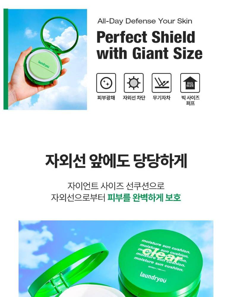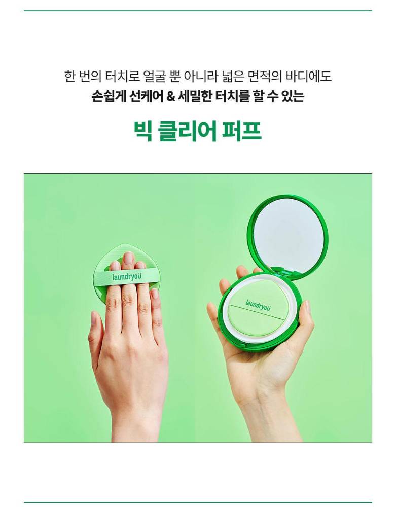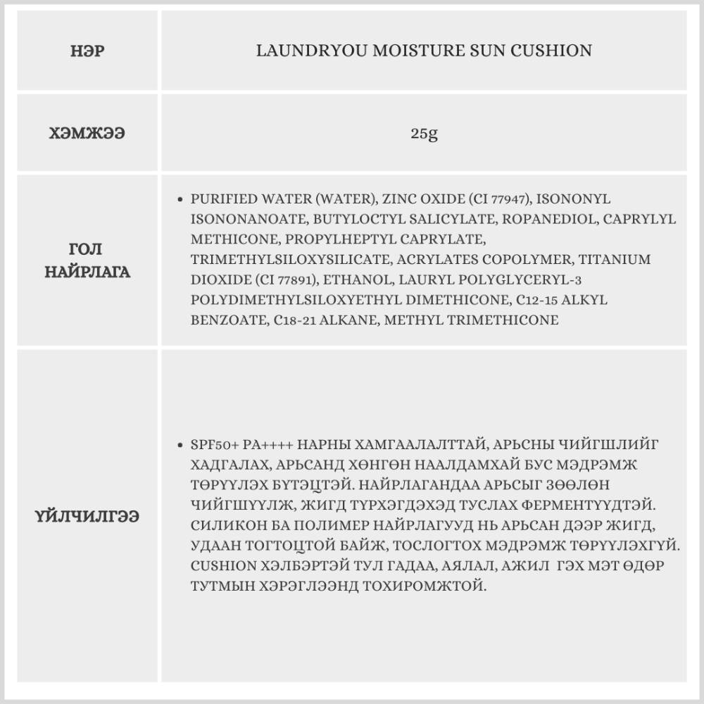 Laundryou брэндийн нарны хамгаалалттай cushion нь нарнаас хамгаалах, чийгшүүлэх, сэрүүцэх үйлчилгээг нэг дор хослуулсан бүтээгдэхүүн юм. Хэрэглэхэд хялбар, авч явах зориулалттай учир өдрийн аль ч үед нарны хамгаалалтыг дахин сэргээн хэрэглэхэд тохиромжтой.