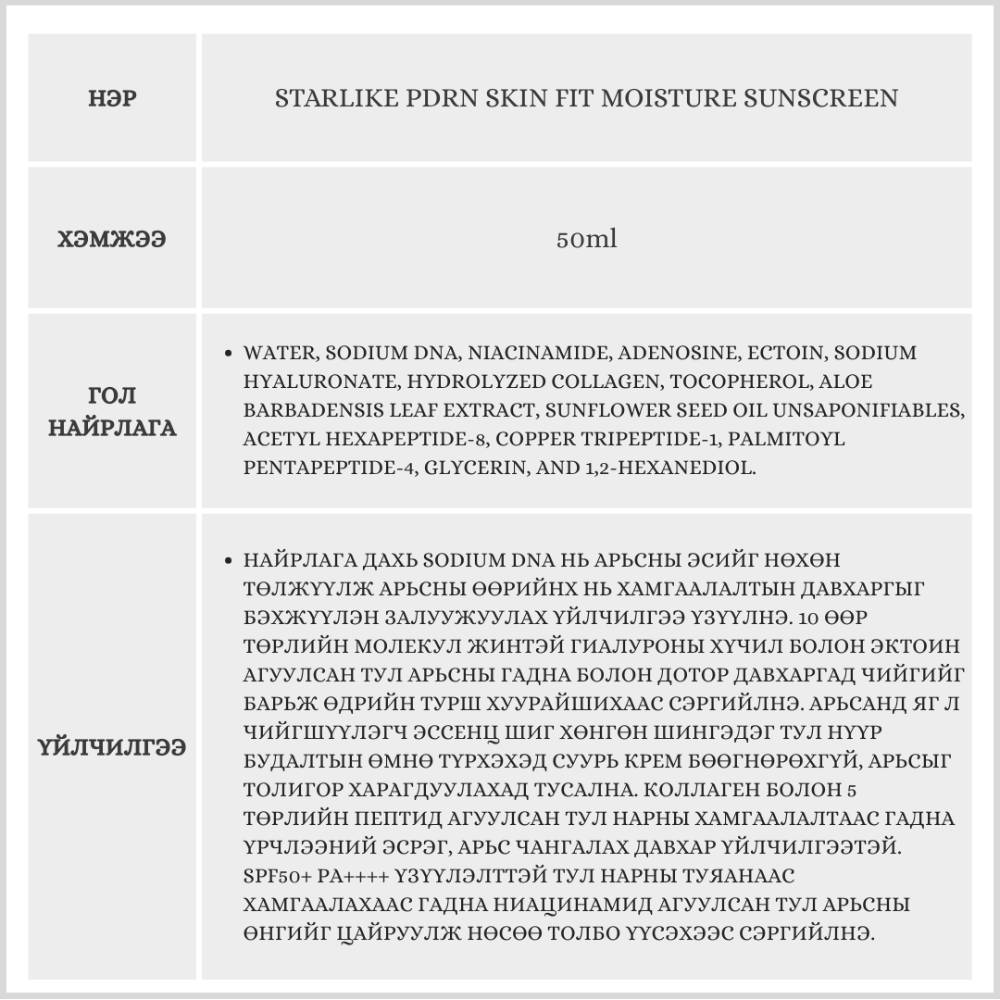 Starlike брэндийн энэхүү нарны тос нь арьсанд маш сайн шингэж өгдөг Makeup ready бүтэцтэй бөгөөд арьсыг гүнээс нь 24 цагийн турш чийгшүүлэх зориулалттай дэвшилтэт бүтээгдэхүүн юм.