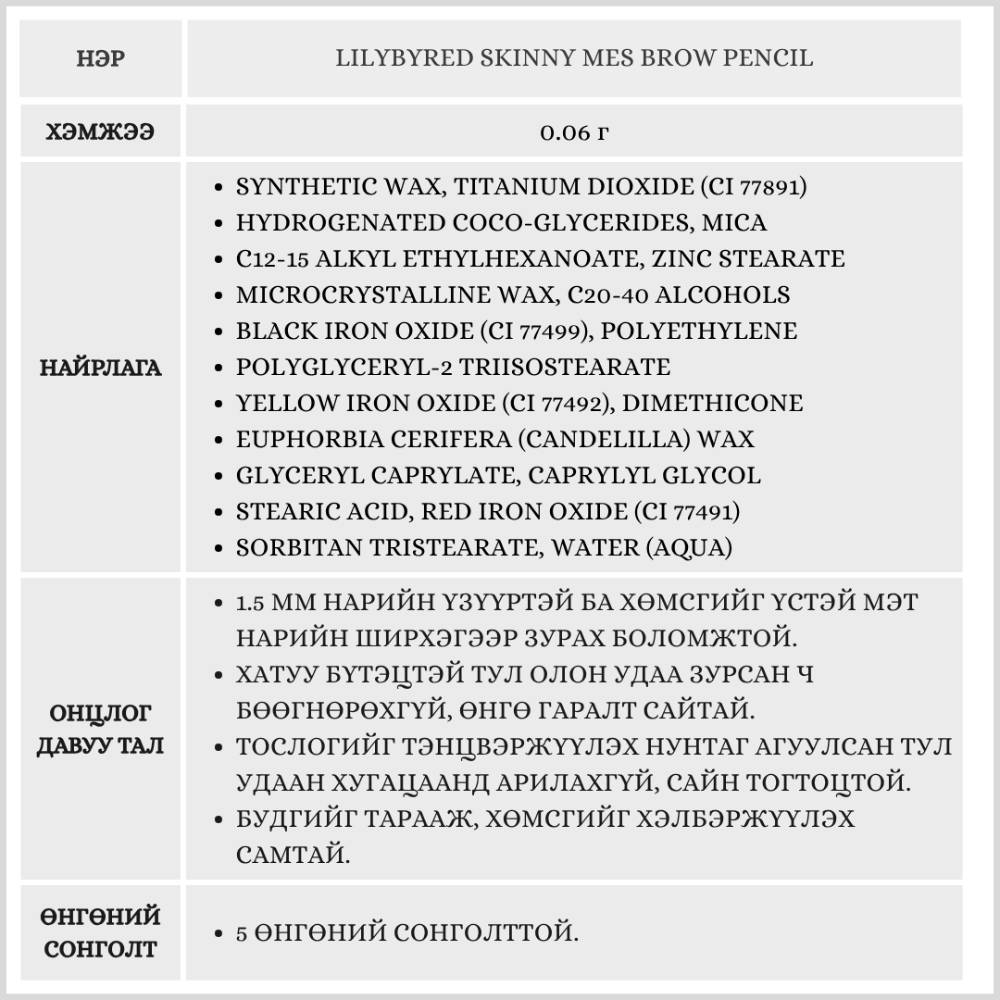 1.5 мм нарийн үзүүртэй тул хөмсгийг үстэй мэт зурах боломжтой хөмсөгний харандаа. Бөөгнөрөхгүй, гаралт сайтай ба удаан тогтоцтой.