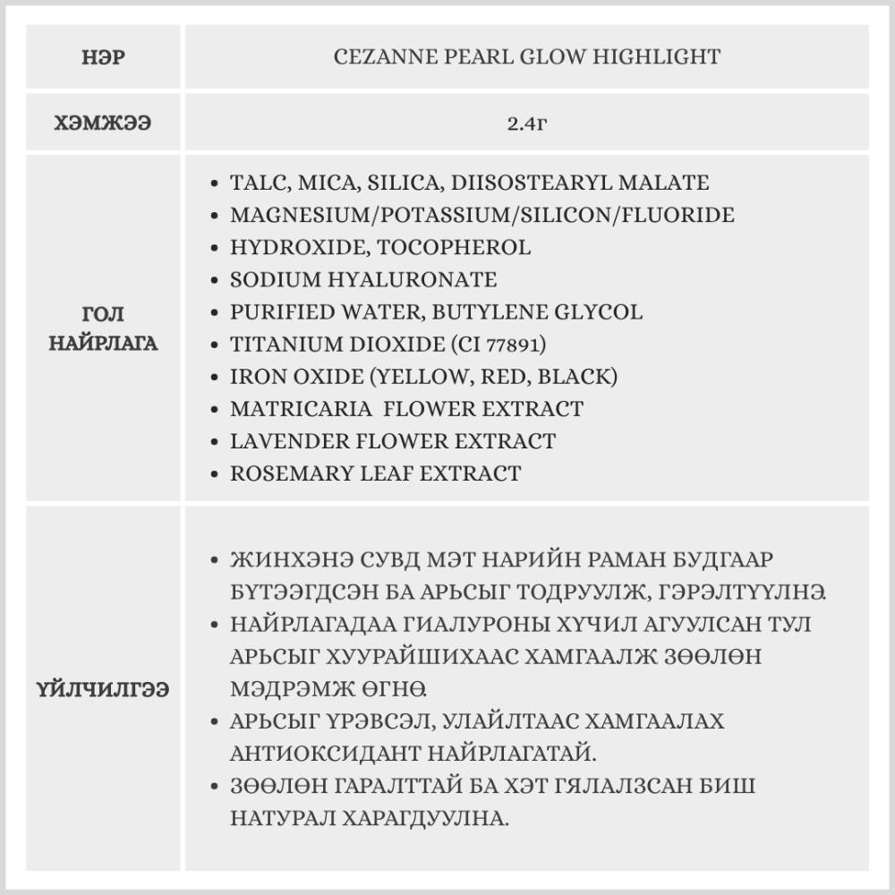 Cezanne-ийн Pearl Glow Highlight нь сувд мэт нарийн, хэт гялбаагүй, зөөлөн гялалзах эффект өгдөг гэрэлтүүлэгч юм. Хацар, хамар зэрэгт түрхэхэд нүүрийг гэрэлтүүлж, илүү тод, эрч хүчтэй харагдуулна. Нунтаг бүтэцтэй ч, арьсыг чийгшүүлж зөөлрүүлэн хуурайшихаас хамгаална. Дотроо багстай.
