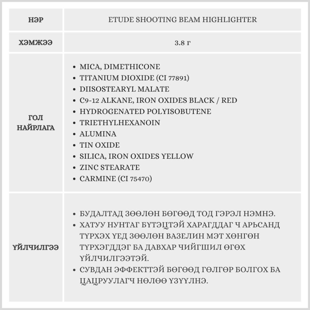 ETUDE брэндийн Shooting Beam буюу тод гялбаа мэт будалтад гэрэл нэмэх гэрэлтүүлэгч. Зөөлөн вазелин мэт бүтэцтэй тул хөнгөн, жигд түрхэгдэх ба давхар арьсанд чийгшил өгнө.
