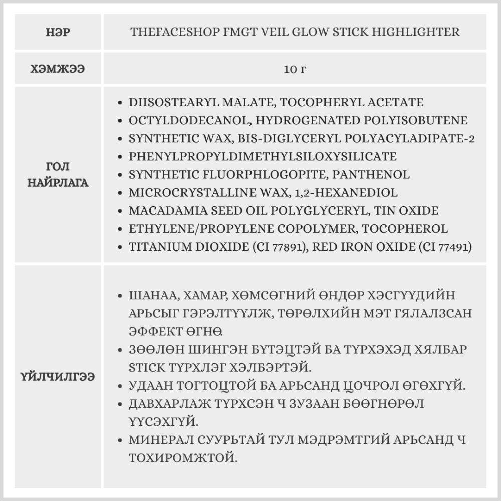 THEFACESHOP fmgt Veil Glow Stick Highlighter, 10g /Гэрэлтүүлэгч/