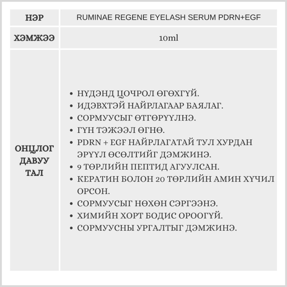PDRN болон EGF комплекс найрлагатай сормуусны ургалтыг дэмжих серум. Сормуусны угийг бэхжүүлж, бат бөх болгох ба сормуусыг тэжээлээр хангаж, өтгөн, урт болгоно.