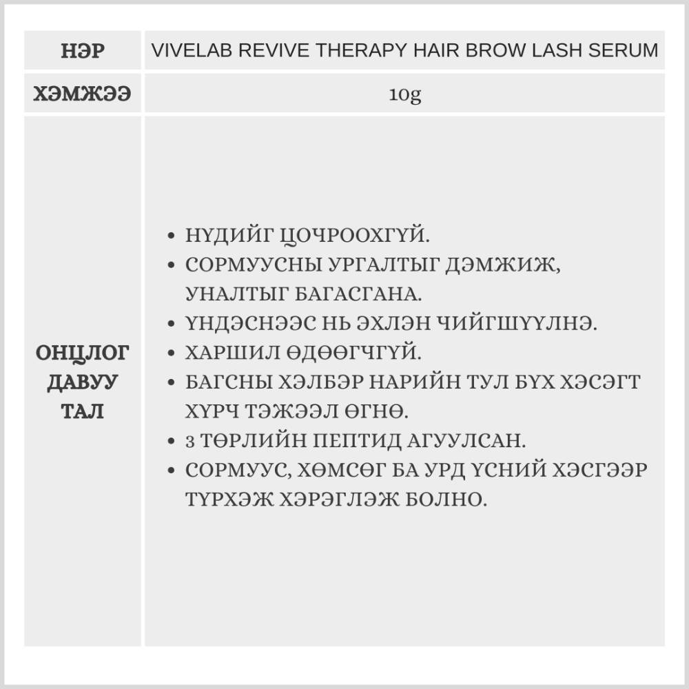 Сормуусны ургалтыг дэмжиж гүн чийгшүүлэхээс гадна тайвшруулах үйлчилгээтэй сормуусны серум. Сормуус, хөмсөгний угийг тэжээлээр хангаж, бат бэх болгож уналтыг багасгана.