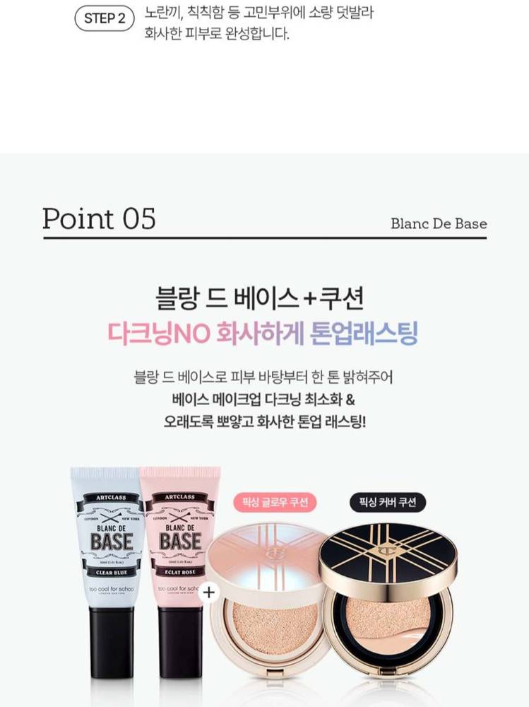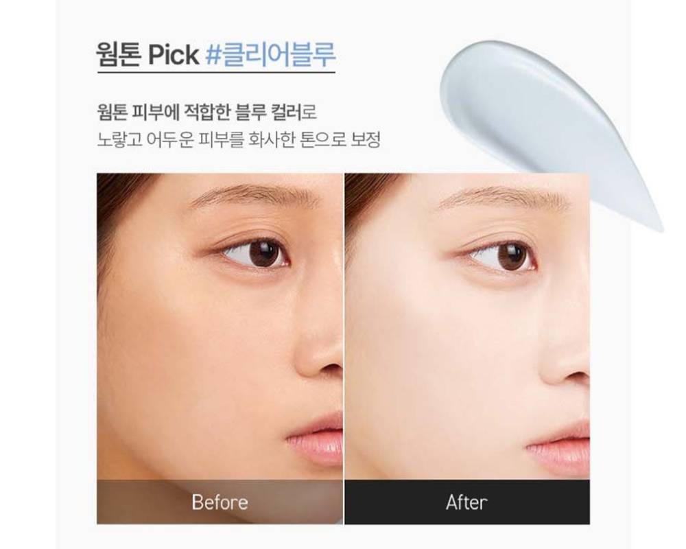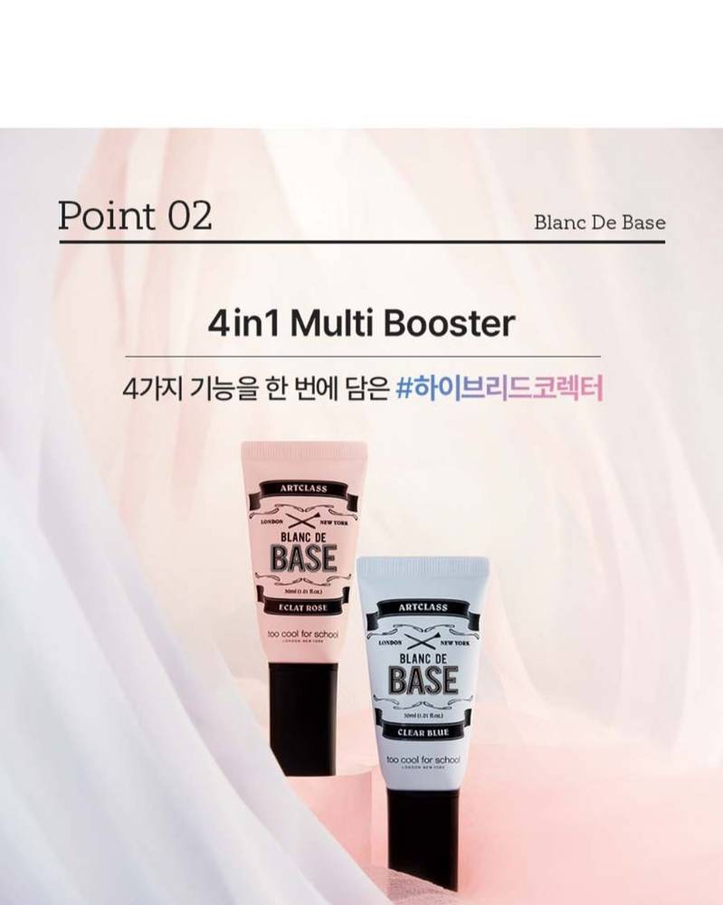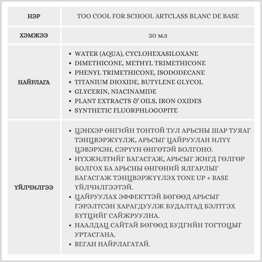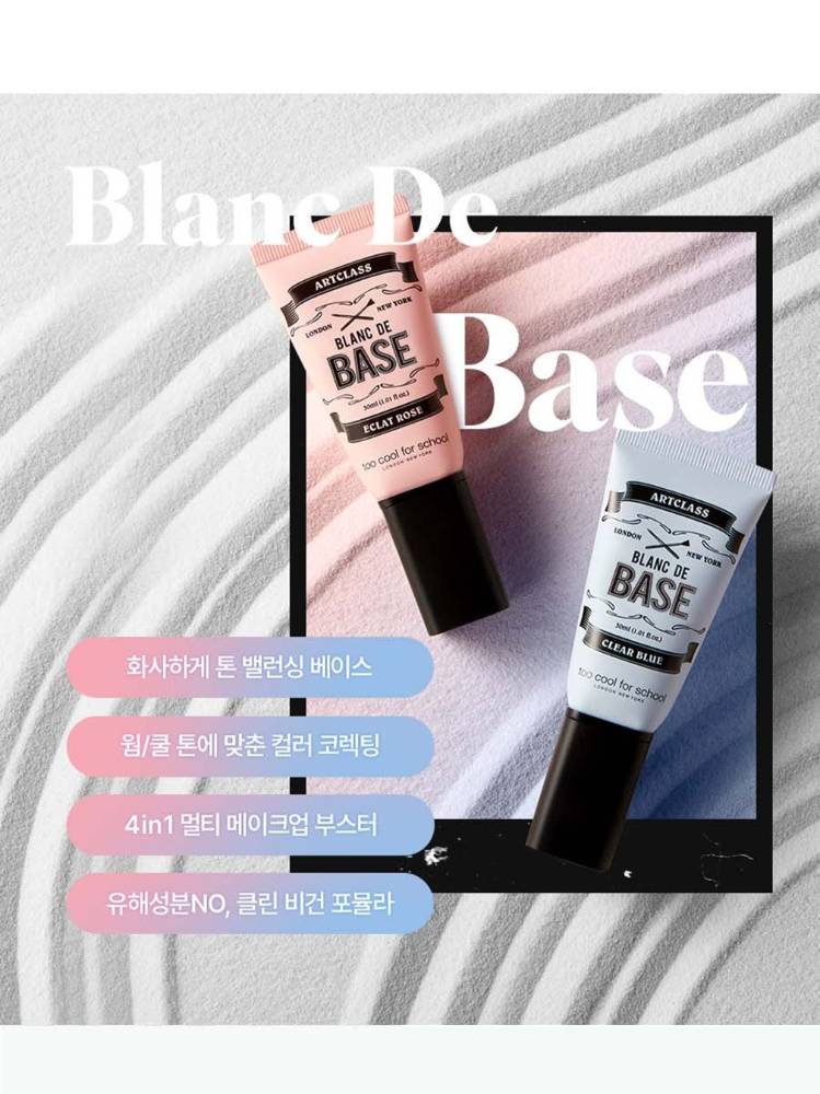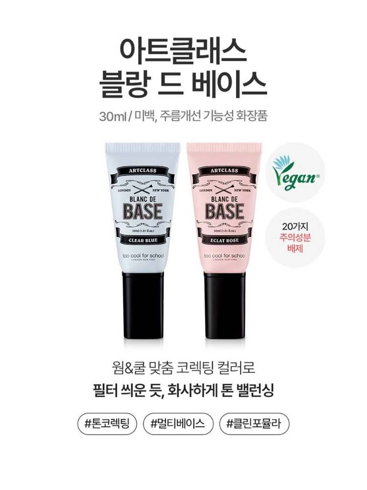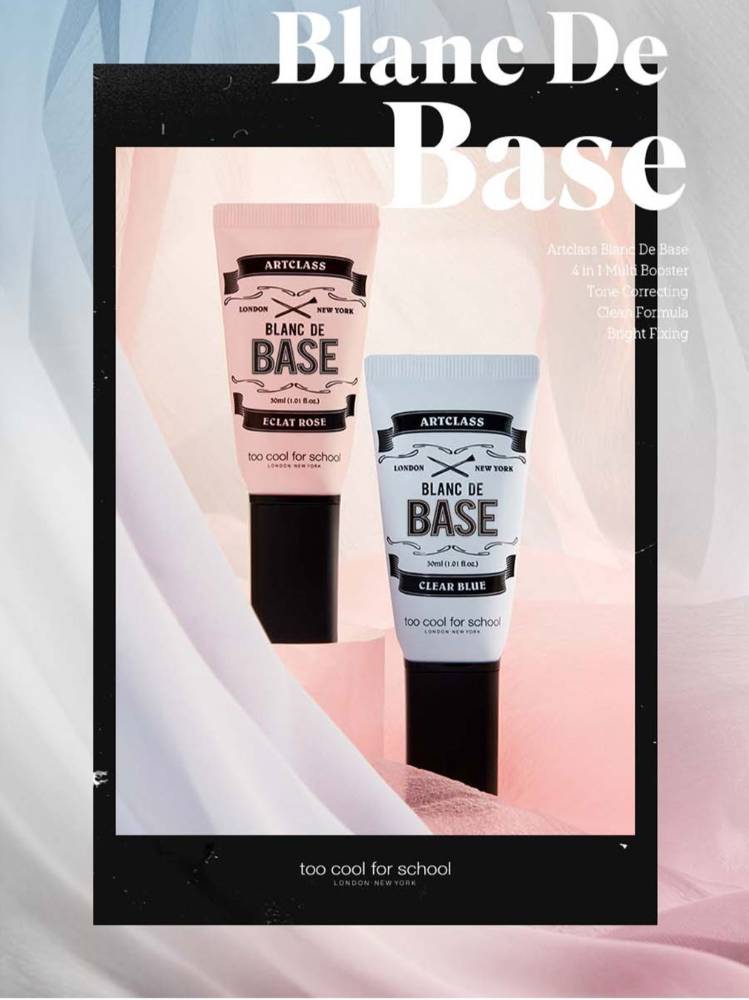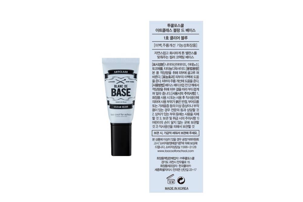 Too Cool For School Artclass Blanc de Base Clear Blue нь цэнхэр туяатай base бөгөөд түрхсэн даруйдаа арьсны шар туяаг тэнцвэржүүлэн өнгийг засаж илүү цэвэрхэн, сэрүүн өнгөтэй болгох ба нүхжилтийг дарж арьсыг гөлгөр, зөөлөн болгон будалтад бэлтгэх tone up + base үйлчилгээтэй.