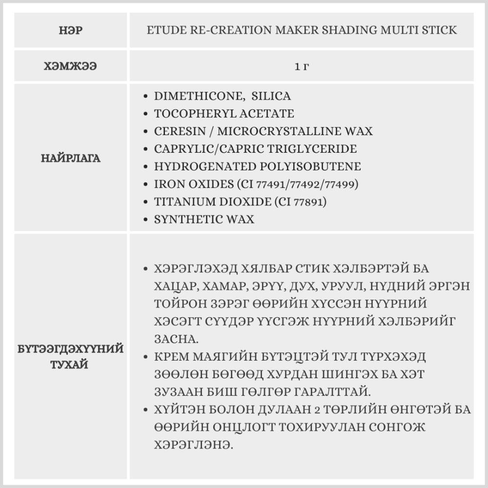 Түрхэхэд хялбар стик хэлбэртэй зөөлөн гаралттай сүүдэр. Удаан тогтоцтой ба дулаан болон хүйтэн 2 төрлийн өнгөтэй тул өөрийн онцлог болон хэрэгцээнд тохируулан өнгөө сонгож хэрэглэнэ.