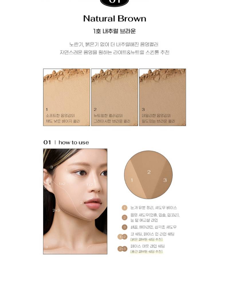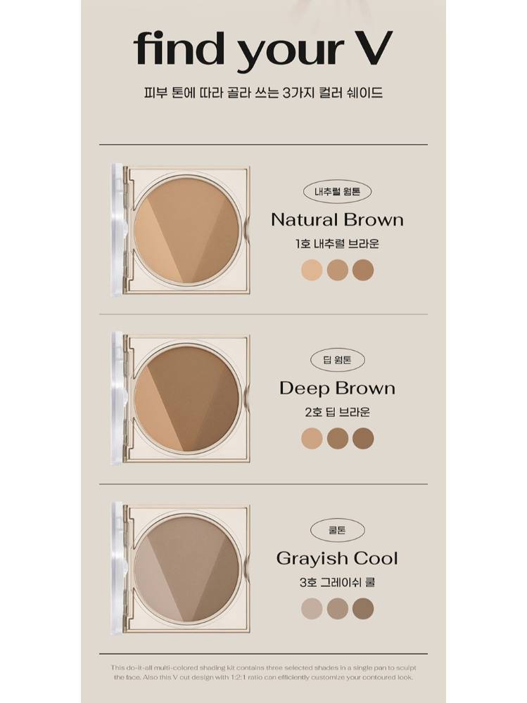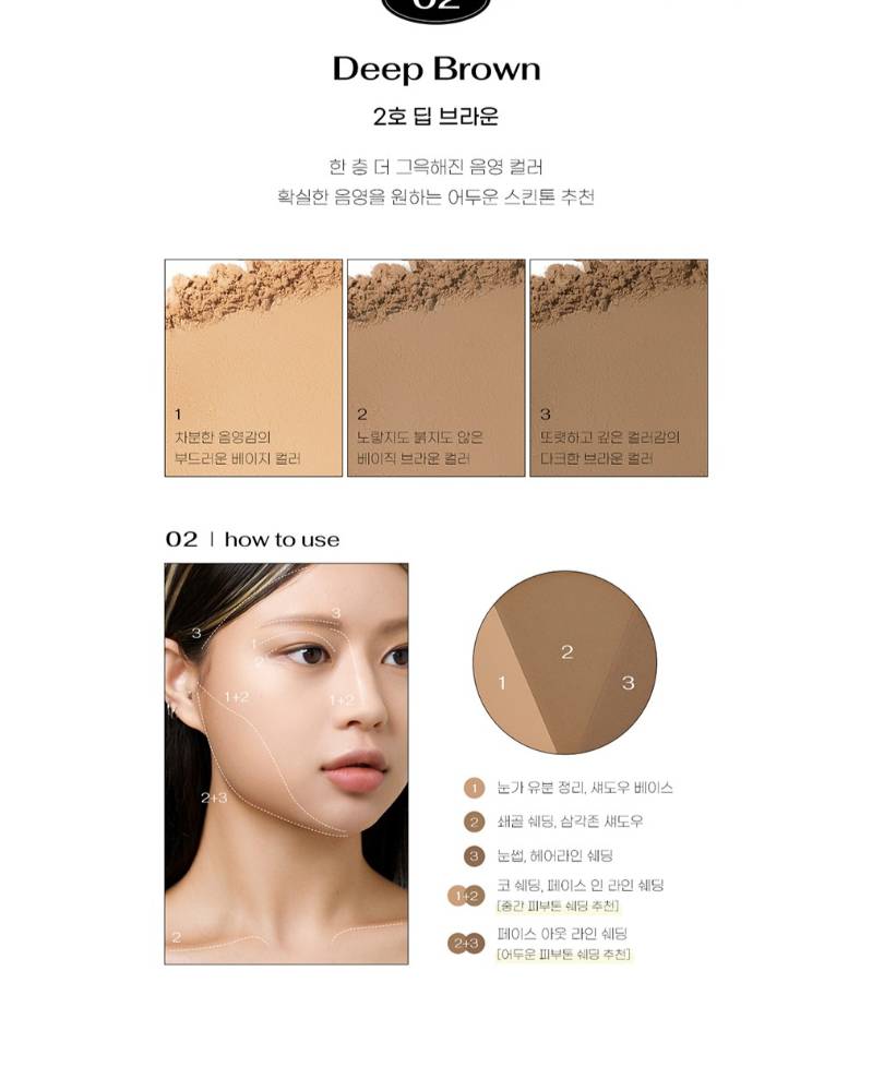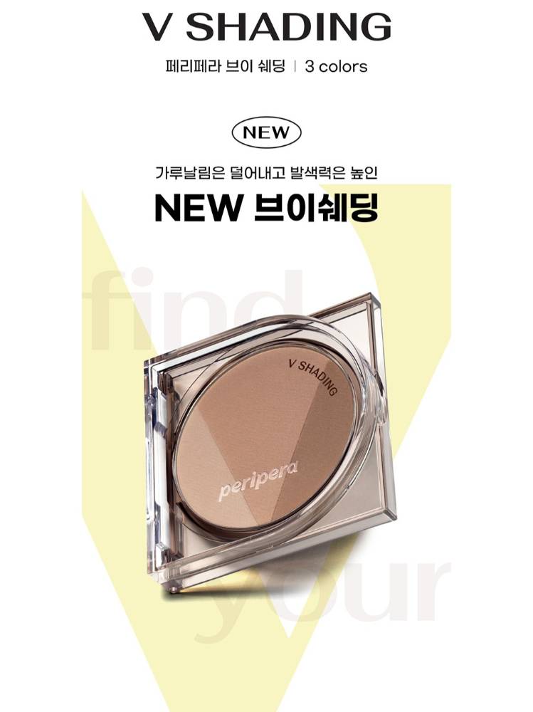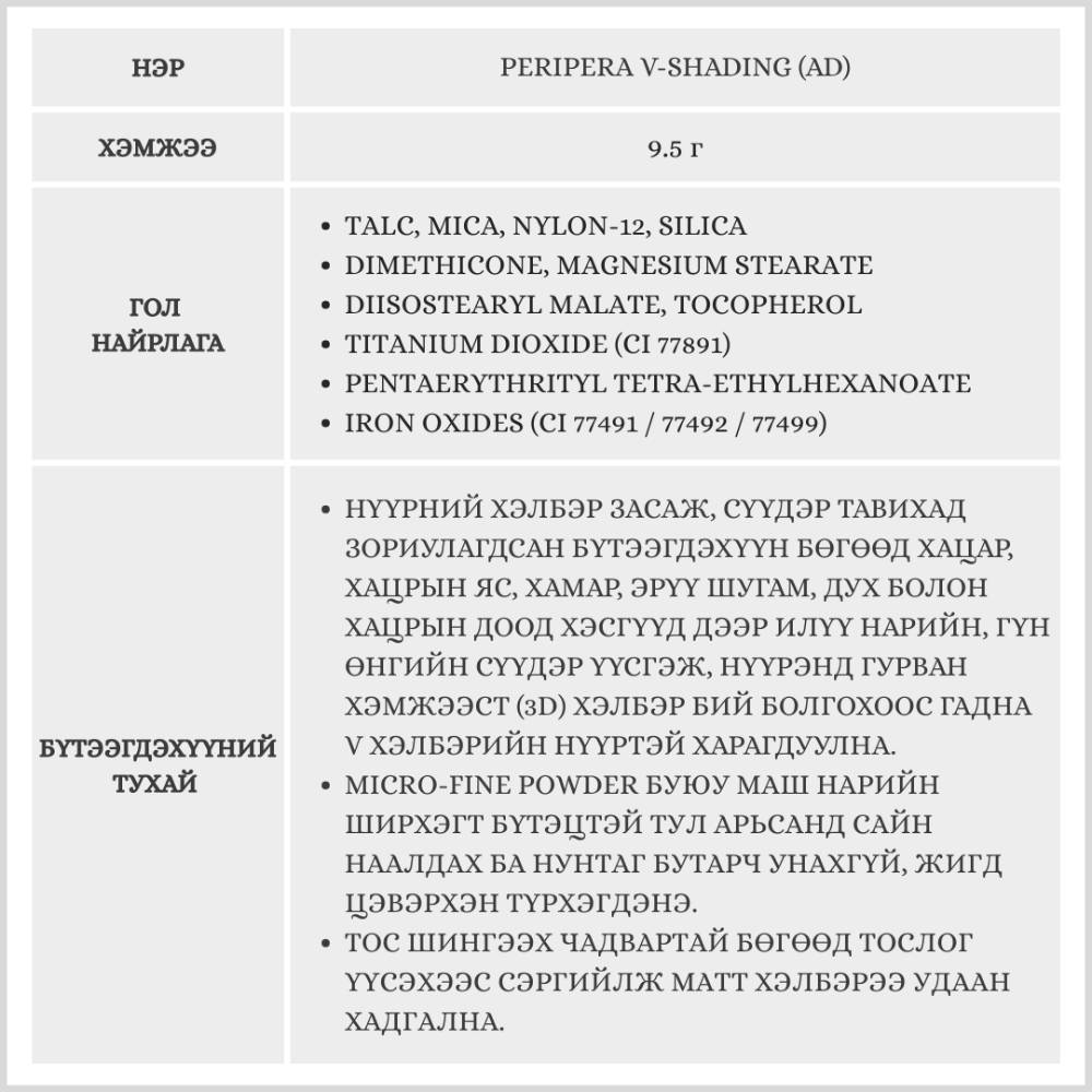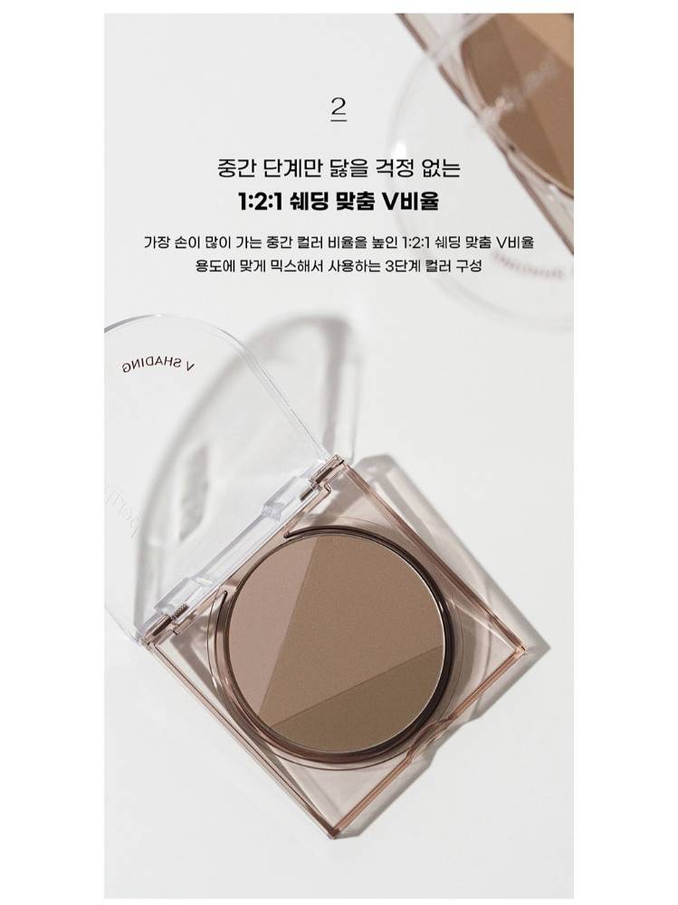 Peripera-ийн V-Shading (AD) сүүдэр нь нүүрний хэлбэрийг тодотгож, хацар, хамар, эрүү зэрэгт байгалийн, 3D сүүдэр үүсгэх үйлчилгээтэй нарийн нунтаг бүтэцтэй бүтээгдэхүүн юм. Нүүрний хэлбэрийг V харагдуулах ба удаан тогтоцтой.