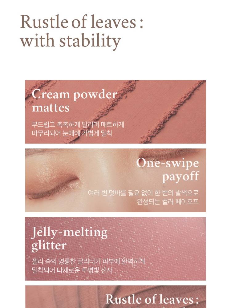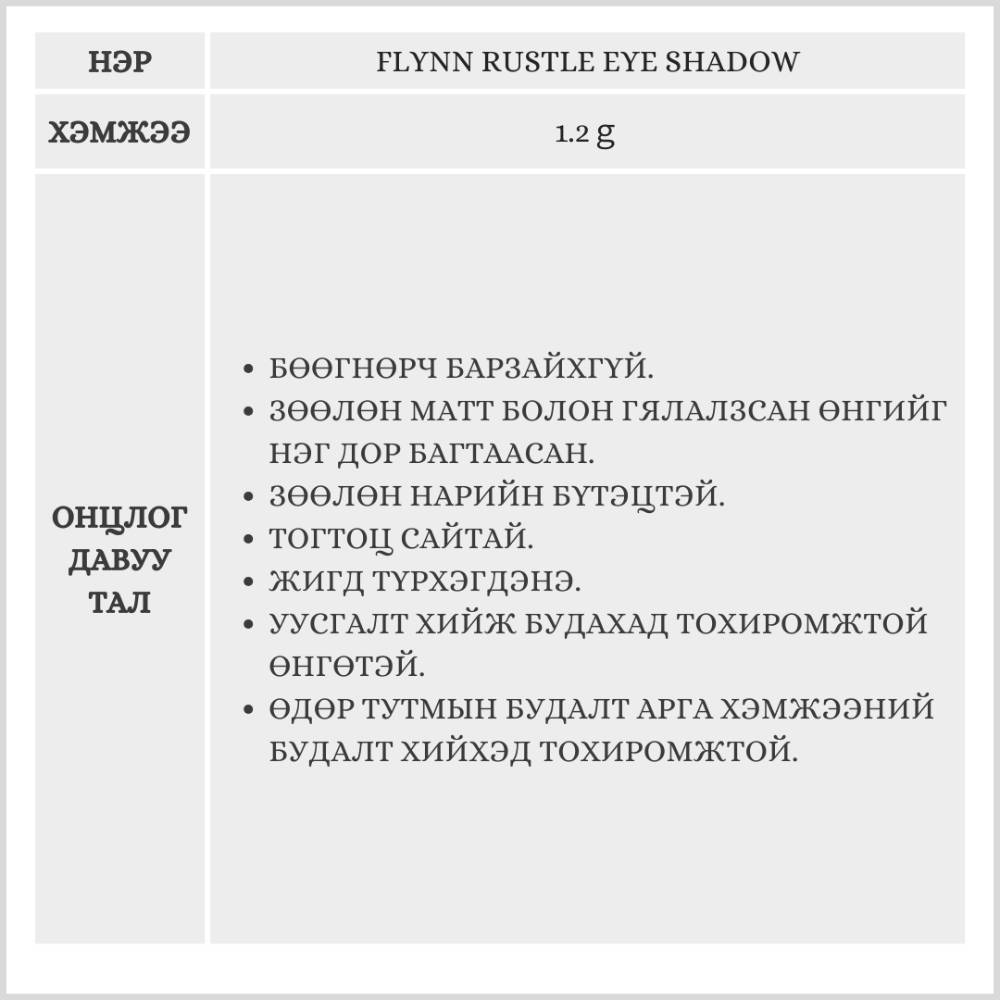 Энэхүү бүтээгдэхүүн нь уусгалт хийж будахад тохиромжтой зөөлөн матт болон гялалзсан өнгийг нэг дор багтаасан нүдний тень юм.