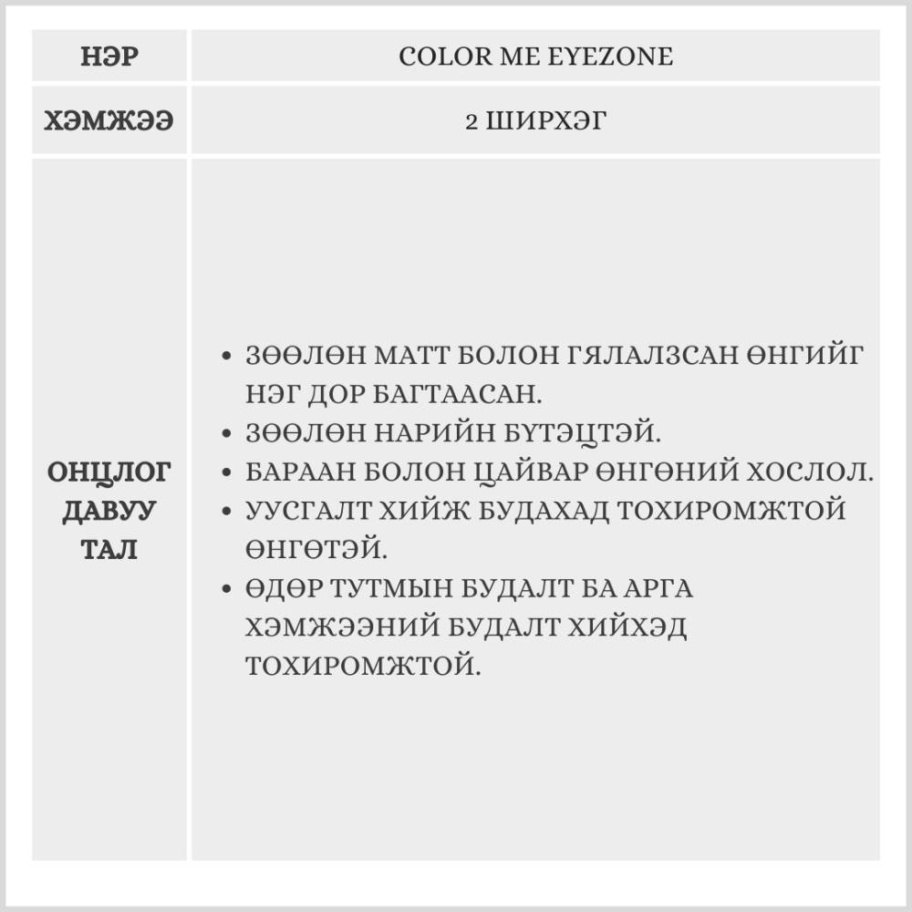 Энэхүү бүтээгдэхүүн нь зөөлөн, нарийн бүтэцтэй бөгөөд бараан болон цайвар өнгийг хослуулсан, өдөр тутмын будалт болон арга хэмжээний будалт хийхэд тохиромжтой нүдний тень юм.