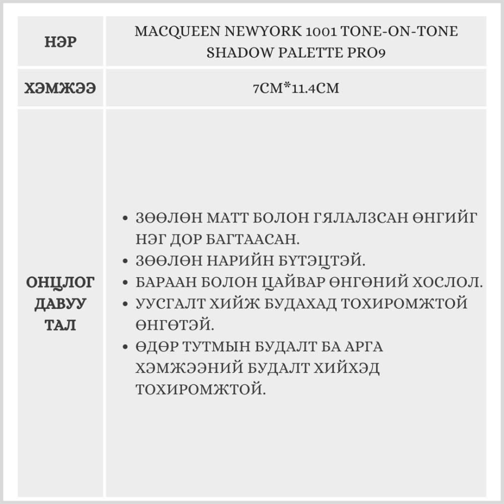 Энэхүү бүтээгдэхүүн нь зөөлөн матт болон гялалзсан өнгийг нэг дор багтаасан Macqueen брэндийн нүдний тень юм.